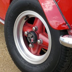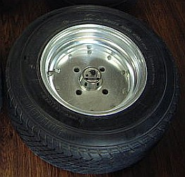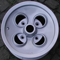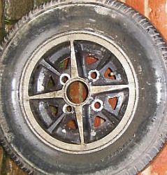 D&A Engineering, 5x10" | This wheel has a lettering on the inseide; "D&A ENGINEERING LTD. OF SURBITON". And some subtle differences in the center cap area. The center cap hole seems smaler and recessed. This is subject of speculation; but probably D&A Engineering bought the original moulds from GKN when the original wheel was discontinued. If anyone can shed more light on this, I'm happy to hear about! |