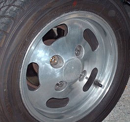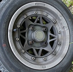 Avon Safety Wheel, 4.5x12" | The Avon Safety Wheel avoids the detachment of a deflated tyre by having a much shallower central recess within the interior of the wheel. The recess is so shallow that the tyre is prevented from twisting, what would allow it to slip over the edge of the rim, so it is retained. Such a shallow recess would also prevent the fitment of new tyres, if it weren't for the inclusion of a deep channel, allowing the bead of the tyre to enter the channel to permit fitting. The channel is covered by a metal band that is tightened around the wheel after the tyre is fitted but before it is inflated. (Source: wikipedia.org) |