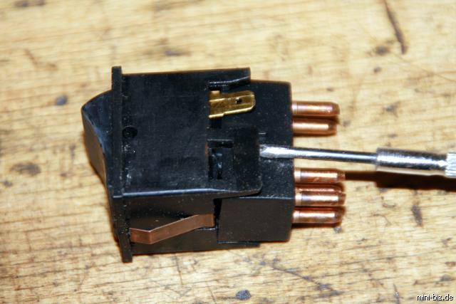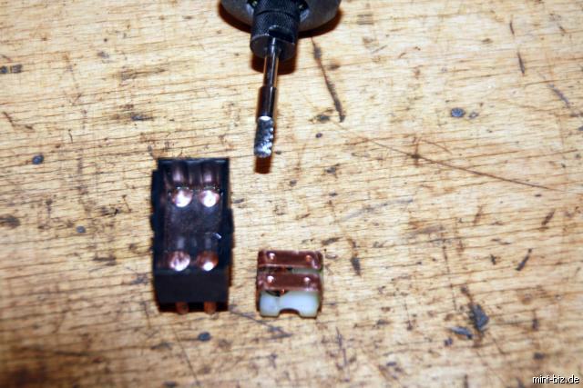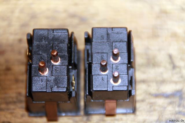 Links ein Nebelschlußleuchtenschalter oder auch Heckscheibenschalter), rechts ein Lichtschalter. Es fehlt nur der Kontakt unten rechts. Um einen neuen Kontaktblock herstellen zu können werden gemäß der Beschreibung vom Warnblinklichtschalter die Wippen von den Kontaktblöcken getrennt. Vom defekten Kontaktblock des Lichtschalters schlägt man mit einem Hammer einen Kontaktstift aus dem Block. Von der Seite, von der auch der Stecker gesteckt wird.