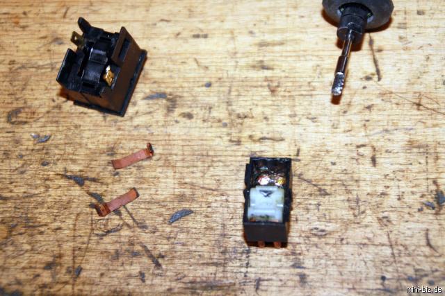 Beim Lichtschalter kann es sein, daß man nur noch Licht bekommt, wenn man etwas mit der Wippe spielt. Auch hier ist die Oxidation der Kontakte das Problem. Durch diese erhöht sicher der Kontaktwiderstand und mit größerem Widerstand wird der Kontakt wärmer. Die Feder des Schaltschlittens drückt den Kontakt weiter in den warmen Kunststoff, dadurch wird der Widerstand noch größer und der Kontakt noch wärmer, bis eben zum Ausfall des Schalters. Man kann der Sache aus dem Weg gehen, indem man die große Last der Scheinwerfer über ein Relais steuert, dann fehlt dem Lichtschalter der hohe Strom und der Kontakt erwärmt sich nicht mehr. Um beim Ausfall des Fahrlichtes sich schnell helfen zu können, kann man den Schalter ausbauen, und am Stecker den braunen Draht mit dem blauen Draht brücken. Hierzu ist halt ein stabiles Stück Draht nötig. Dann sollte das Fahrlicht wieder funktionieren. Braucht man aber auf die Schnelle einen Lichtschalter kann man ihn aus zwei Schaltern im Fundus neu bauen.