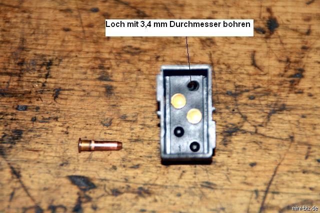 Genau mittig dieser Erhöhung wird ein Loch mit 3,4 mm gebohrt. Nimmt man 3,5 mm, klemmt der Stift nicht so gut und sollte festgeklebt werden.