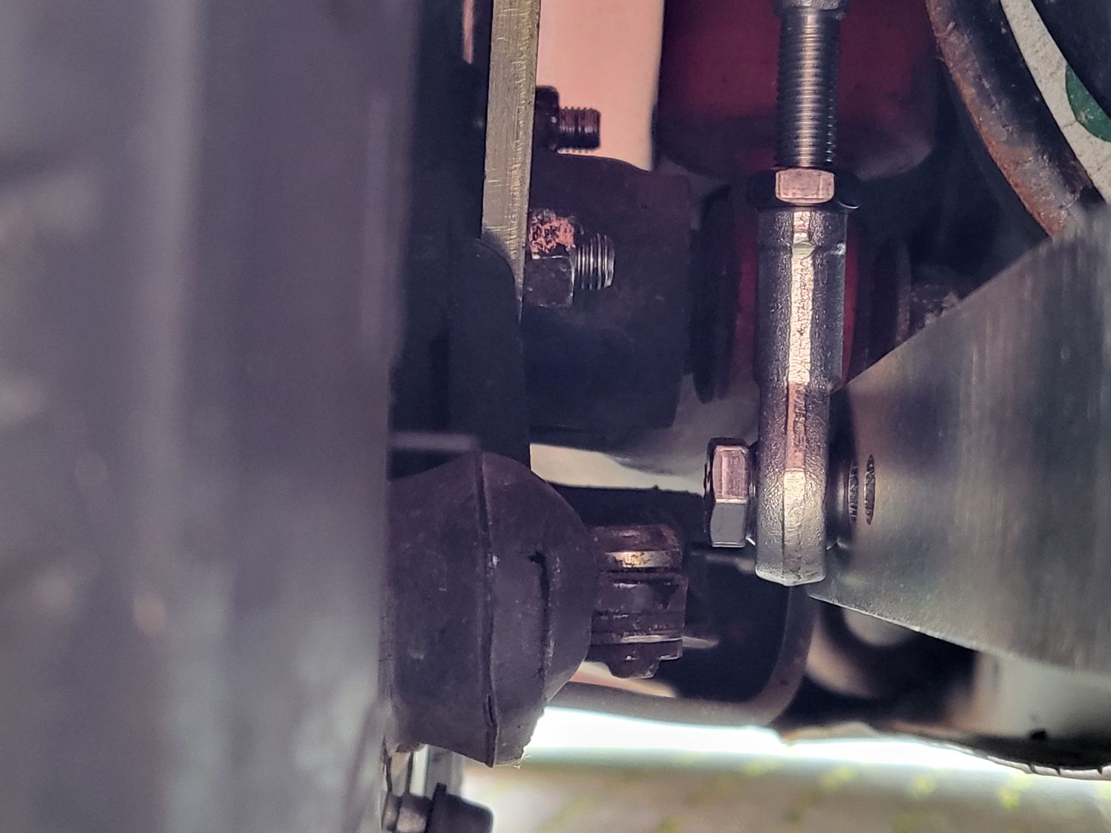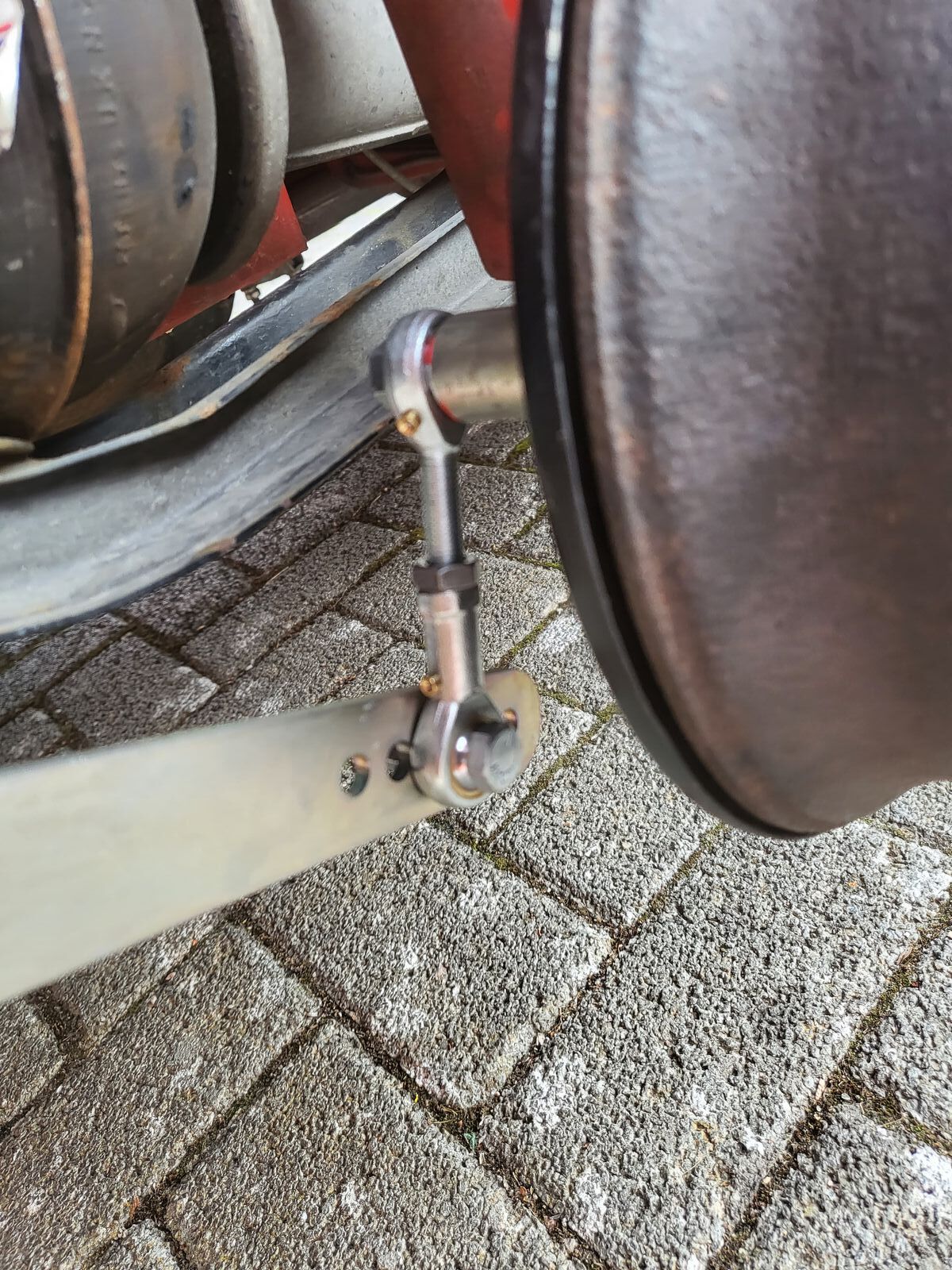 Also Hintern hoch, Räder runter, jetzt die Stabischwinge von Auge trennen. Und dann die beiden Augen zusammen drehen. Ich habe jetzt 11mm vom Gewindeende am Auge und der Kontermutter. Alles wieder zusammen und auf die Räder. Jetzt hat die Schwinge 15-16 mm zur Handbremse. Das ist gut.