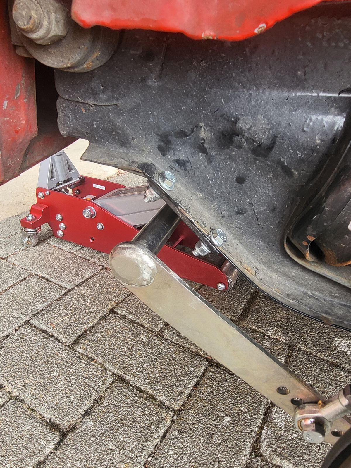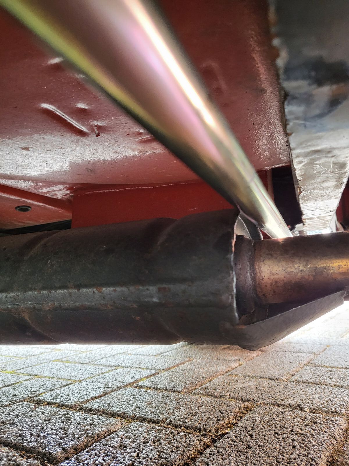 Zuerst dachte ich mir, wie hebe ich den Mini jetzt an. Der Stabi verhindert ja die Seitenneigung. Aber der seitliche Wagenheber macht ja genau das. Und der Stabi arbeitet dagegen. So müsste doch eine wahnsinns Spannung im System sein. Also habe ich eine Heberaufnahme (Mittelauspuff) gebastelt, damit ich jetzt hinten und vorne in der Mitte über den Hilfsrahmen anheben kann. Also nicht mehr Rechte Seite, linke Seite, sondern Hinterräder, Vorderräder.
