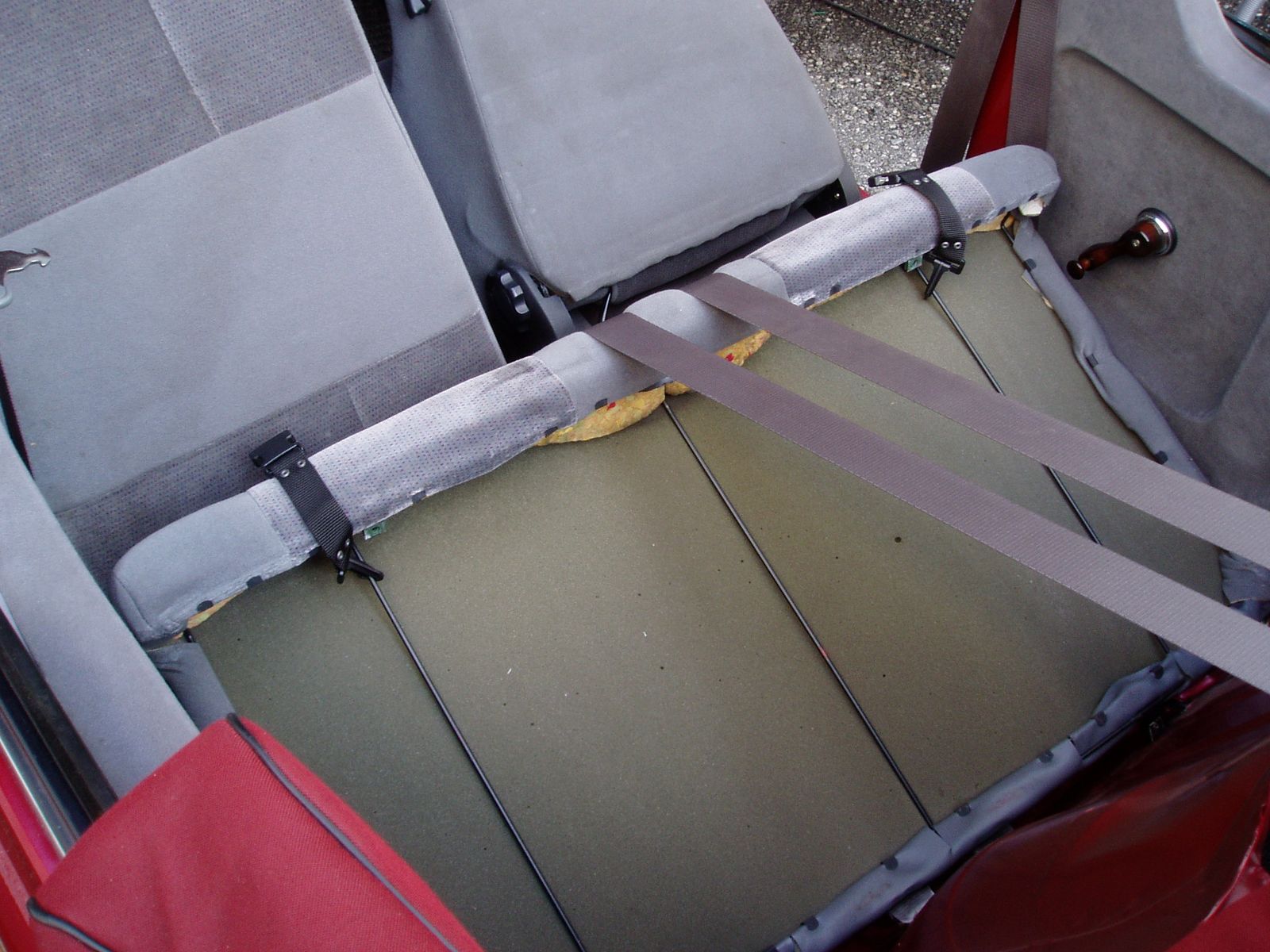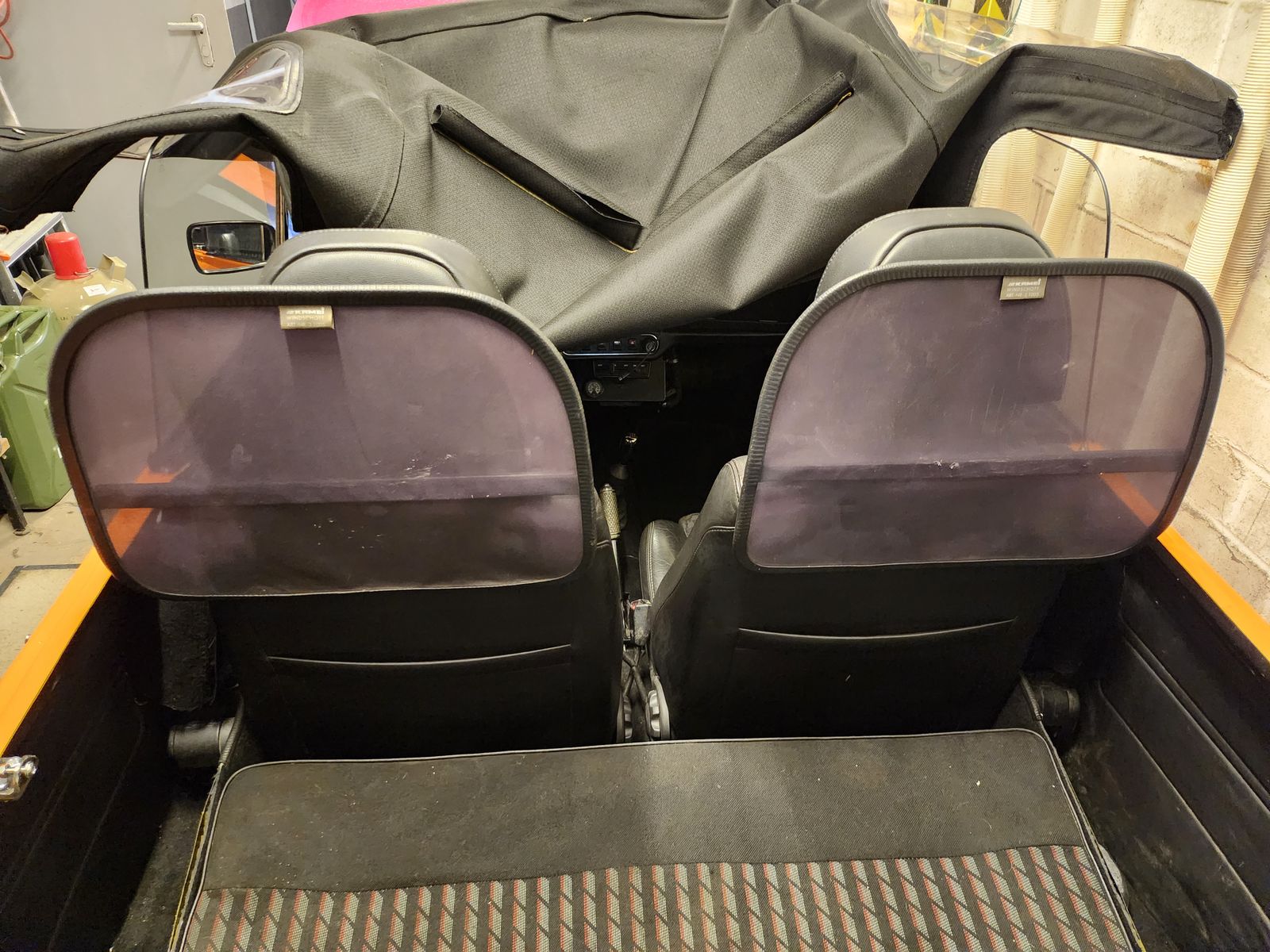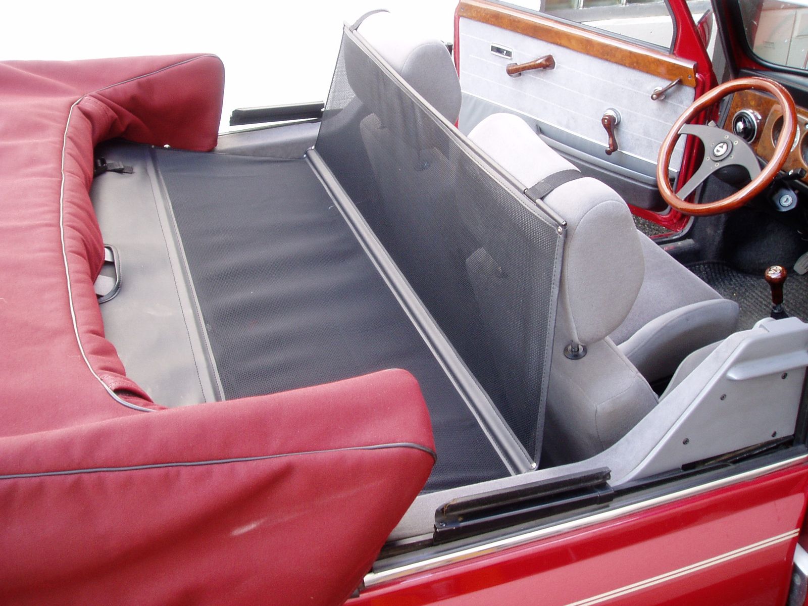 • Das erste Bild ist das extra angefertigte Schott. Der graue Kunstlederstreifen liegt über der Rückenlehnen. Er ist dahinter mit zwei Gurten an z.B. hinter der Lehne zu montierenden Gegenstücken der Schließen eingesteckt, Zwei Gurte laufen vor der Rückenlehne unten an die Sitzbank und werden ebenfalls mit zwei Schließen befestigt (z.B. da wo die Lehne zusammen mit der Sitzbank am Blech verschraubt ist. Zwei Gurte laufen an der Rückseite der Vordersitzlehnen runter und werden dort eingesteckt. Die Hakengurte werden vorne über die Kopfstützen an den Stangen eingehakt. Wenn es einmal drin ist, ist es ruckzuck ein- und wieder ausgebaut. Foto vom eingebauten Schott finde ich leider nicht mehr. Das Dach kann ich auch nicht aufmachen, da der Mini ohne Motor hochgebockt in der Garage steht - die Deckenhöhe reicht einfach nicht mehr zum Öffnen.