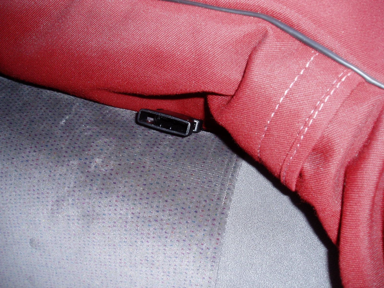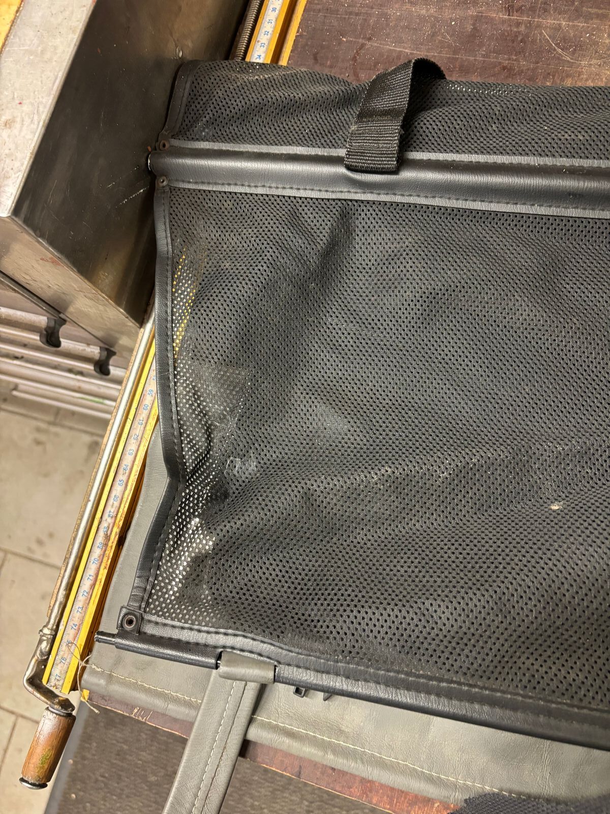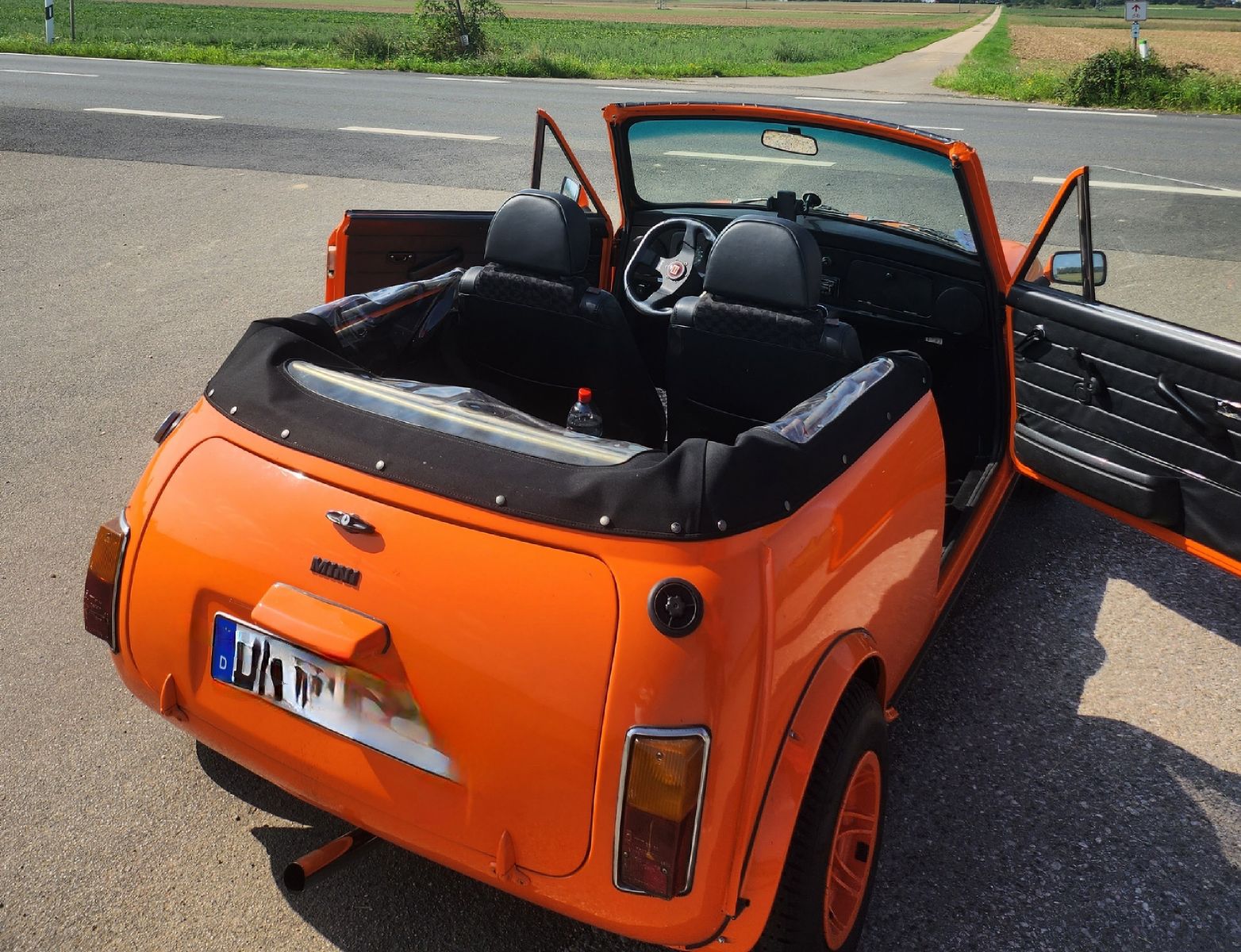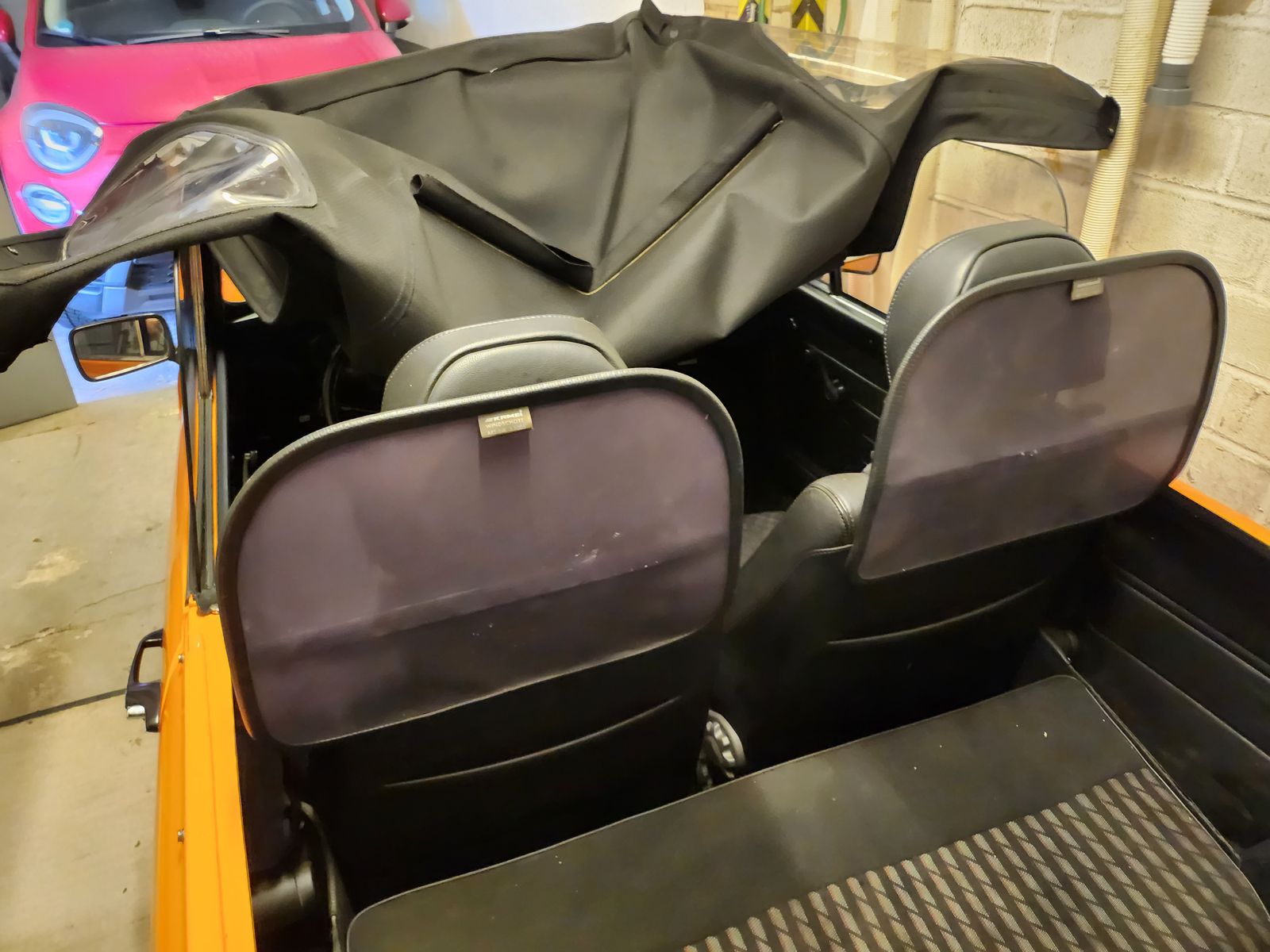 • Das erste Bild ist das extra angefertigte Schott. Der graue Kunstlederstreifen liegt über der Rückenlehnen. Er ist dahinter mit zwei Gurten an z.B. hinter der Lehne zu montierenden Gegenstücken der Schließen eingesteckt, Zwei Gurte laufen vor der Rückenlehne unten an die Sitzbank und werden ebenfalls mit zwei Schließen befestigt (z.B. da wo die Lehne zusammen mit der Sitzbank am Blech verschraubt ist. Zwei Gurte laufen an der Rückseite der Vordersitzlehnen runter und werden dort eingesteckt. Die Hakengurte werden vorne über die Kopfstützen an den Stangen eingehakt. Wenn es einmal drin ist, ist es ruckzuck ein- und wieder ausgebaut. Foto vom eingebauten Schott finde ich leider nicht mehr. Das Dach kann ich auch nicht aufmachen, da der Mini ohne Motor hochgebockt in der Garage steht - die Deckenhöhe reicht einfach nicht mehr zum Öffnen.