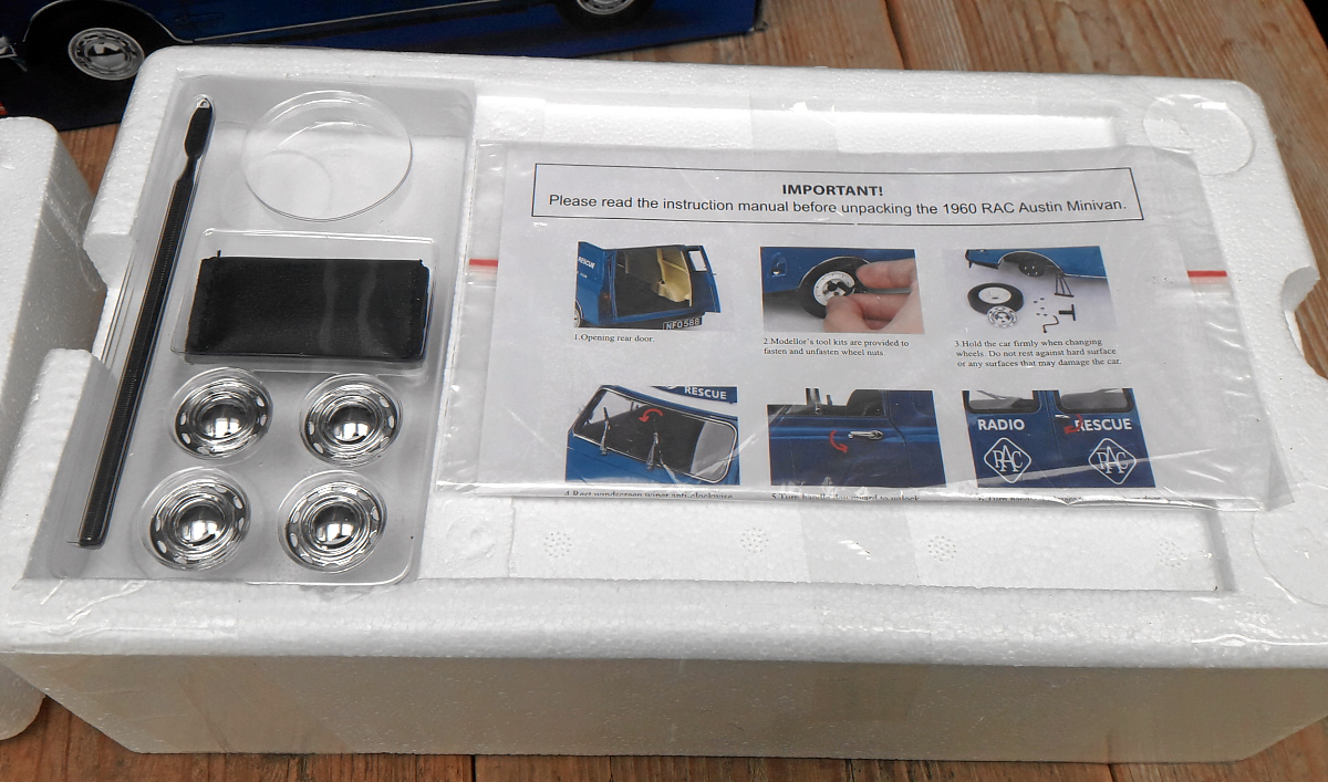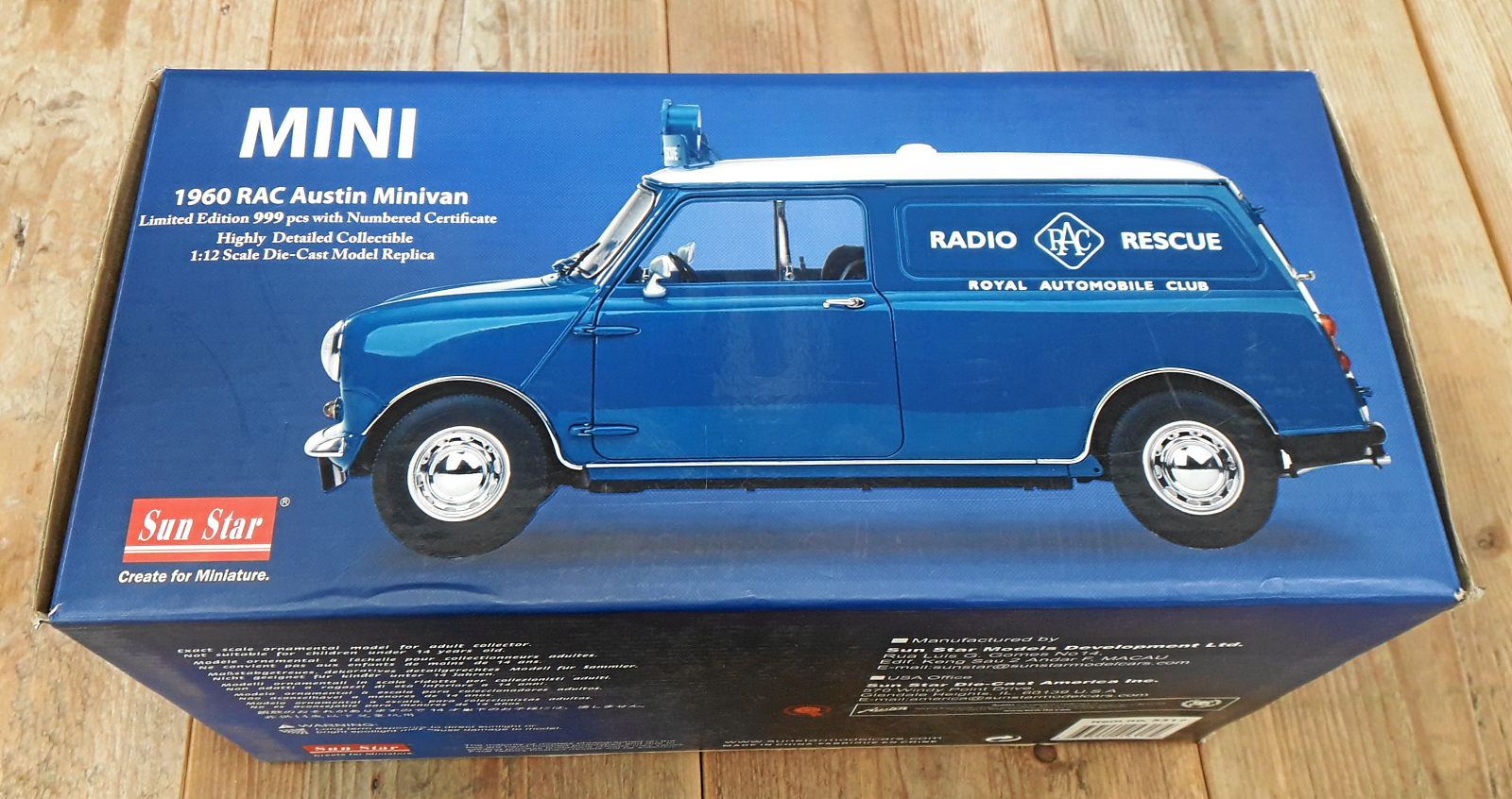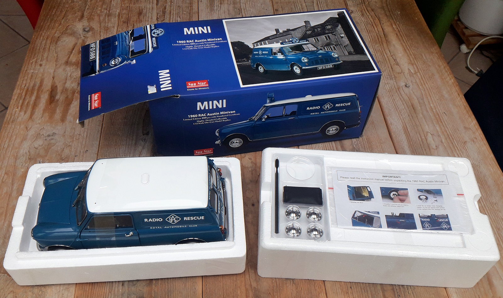 Also trenne ich mich schweren Herzens von diesem 1:12 Mini Van RAC Radio Rescue. Das Modell ist flammneu, hat die Verpackung noch nie verlassen. Alle beweglichen Teile sind noch original fixiert. Selbstverständlich incl. sämtlicher original verpackter Ersatzteile, das Dachschild liegt in der unteren Schachtelhälfte, unter dem verschraubten Modell.