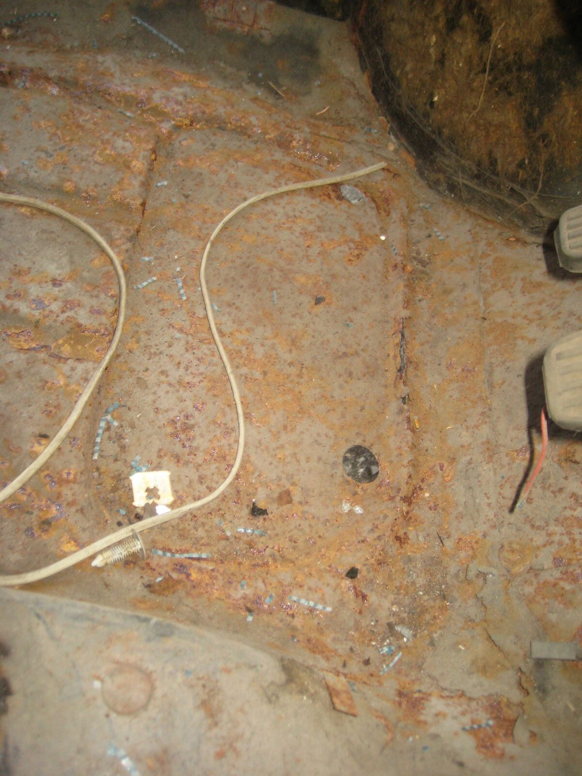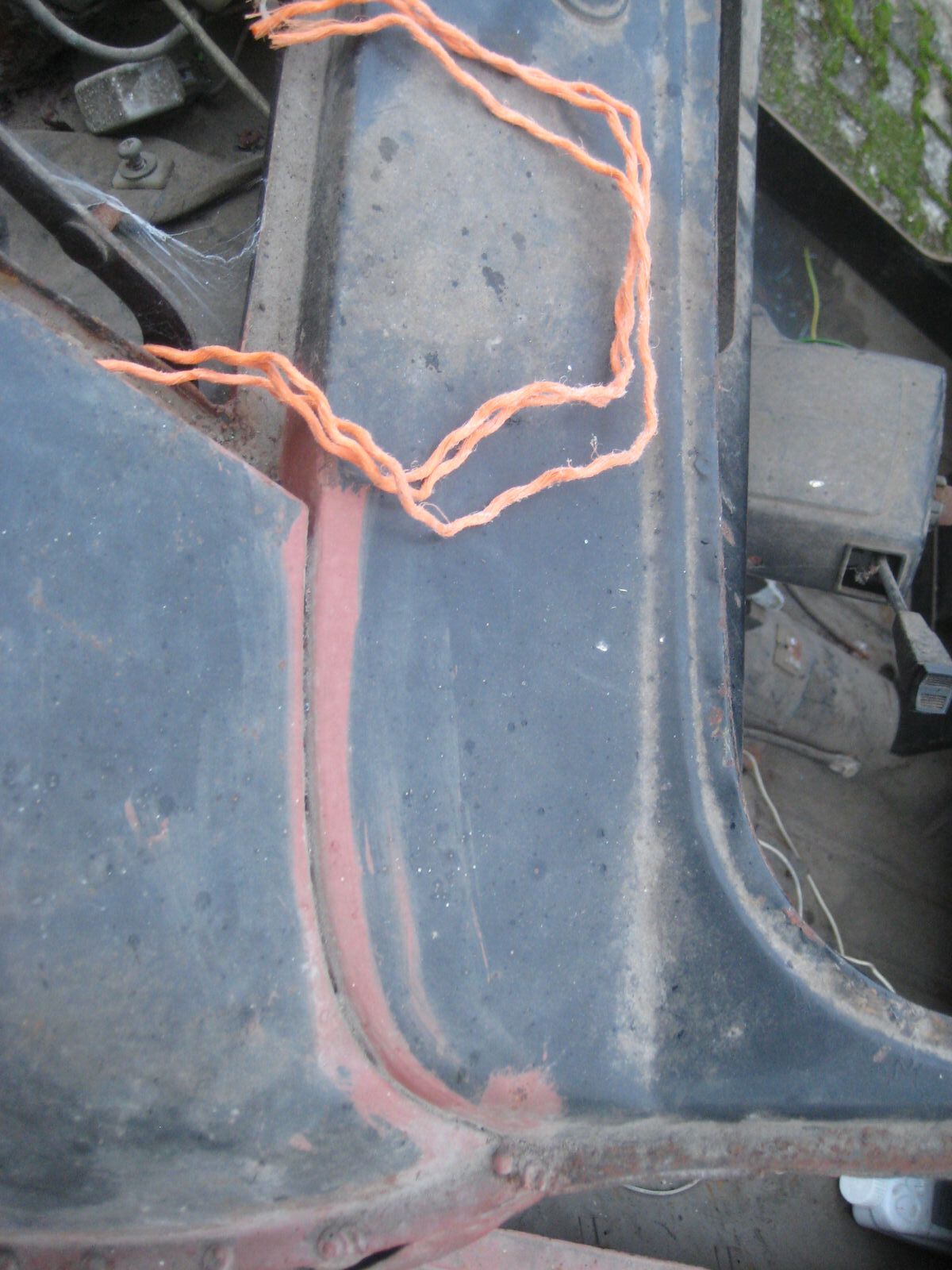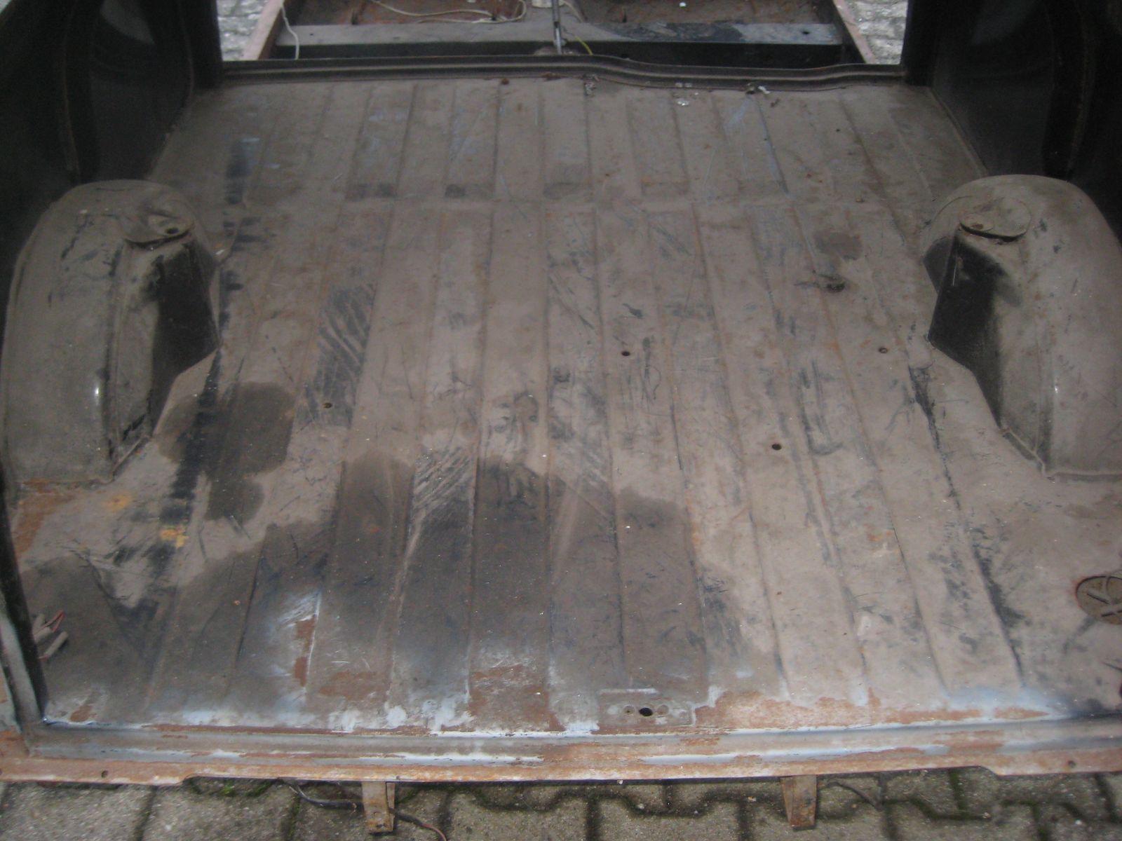 Wo was getan werden muss, sind beide Fußräume und weiter hinten rechts, wo die Batterie befestigt wird, das Bodenblech. Dazu die beiden äusseren Dreiecksbleche und der rechte Schweller.