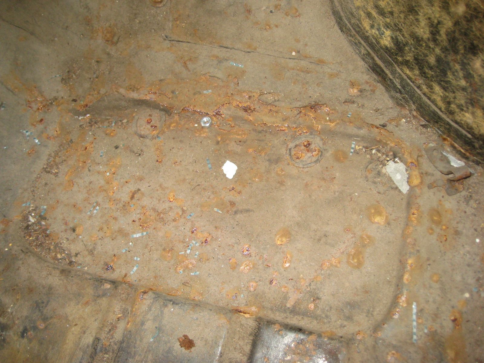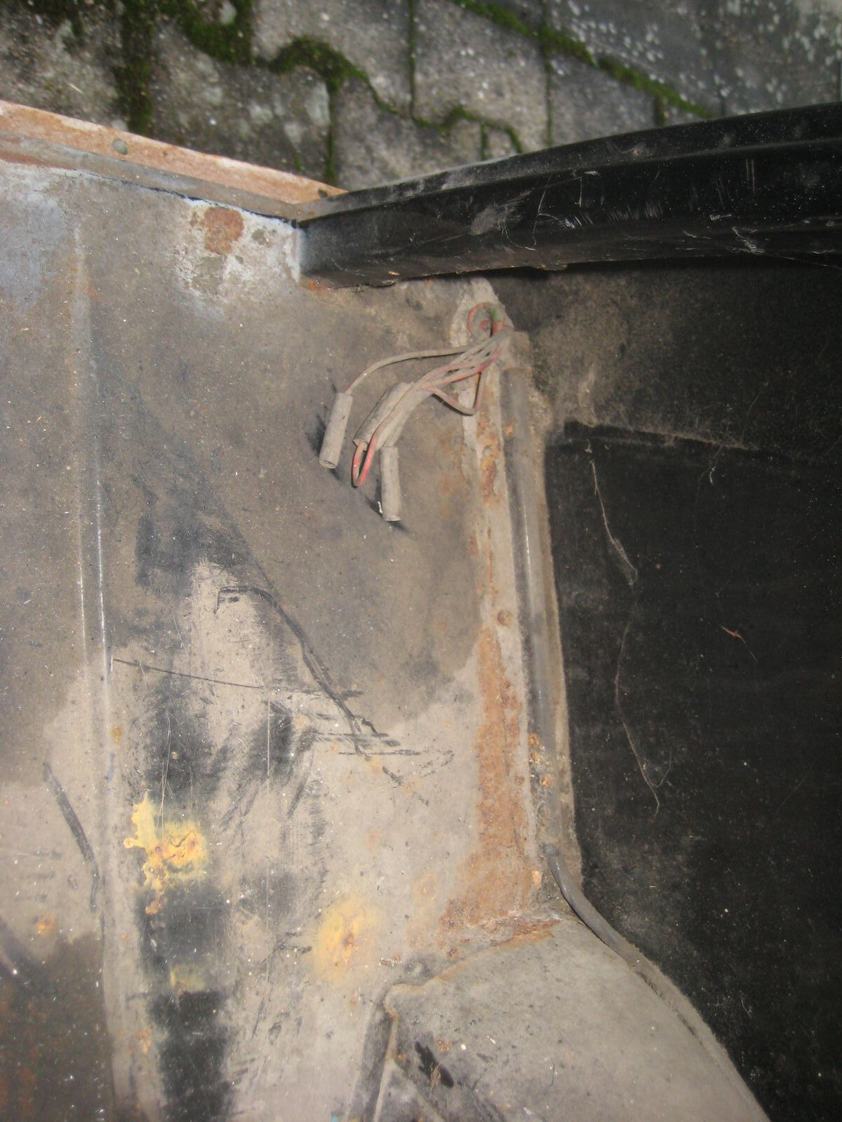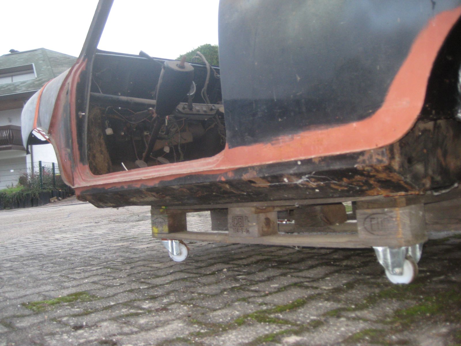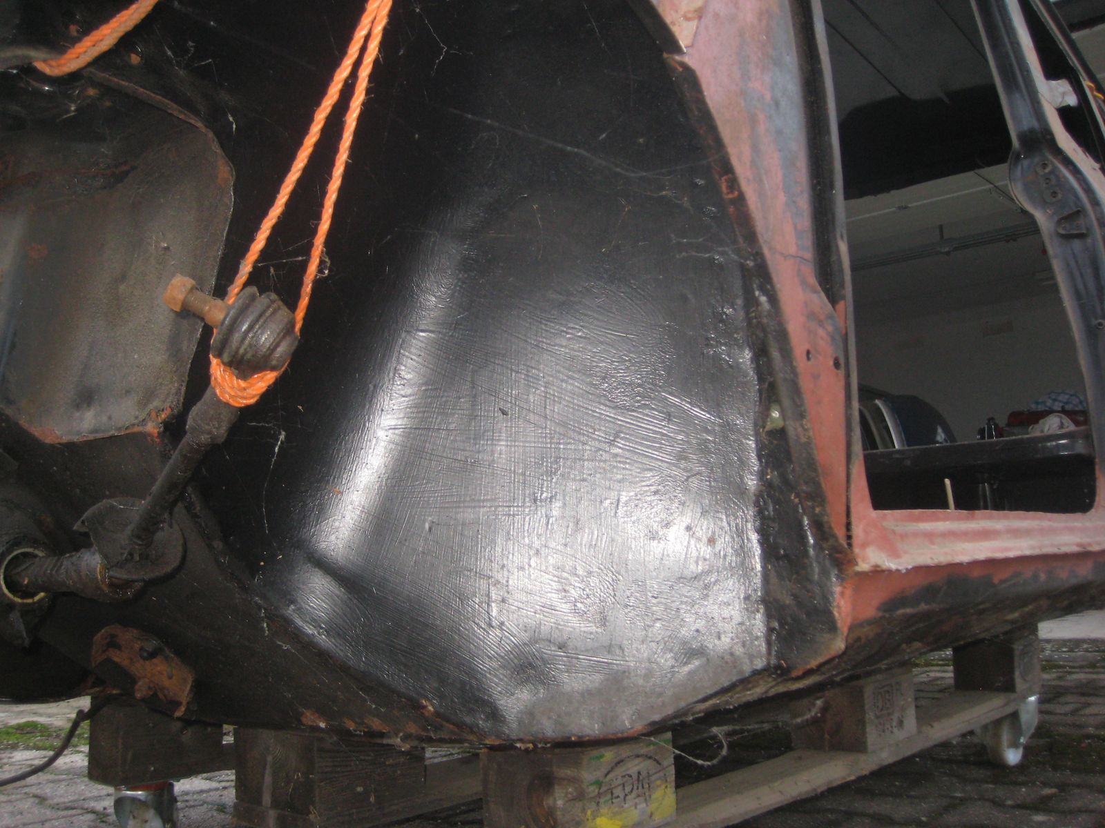 Wo was getan werden muss, sind beide Fußräume und weiter hinten rechts, wo die Batterie befestigt wird, das Bodenblech. Dazu die beiden äusseren Dreiecksbleche und der rechte Schweller.