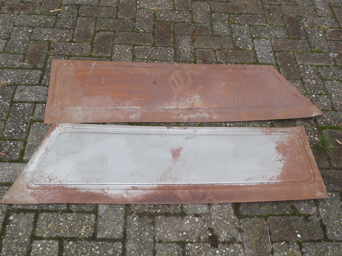 Die Niederländer schneiden ja gerne die Seitenteile auf, um Fenster einzusetzen. Ich habe aber die Bleche, um die Löcher wieder zuzuschweißen. Die Bleche haben etwas Flugrost angesetzt, und müssen wieder blank geschliffen werden.
