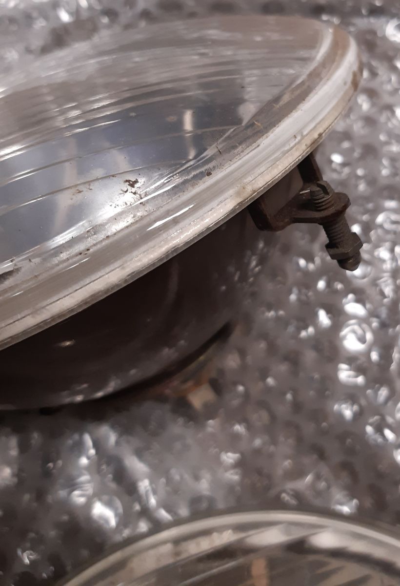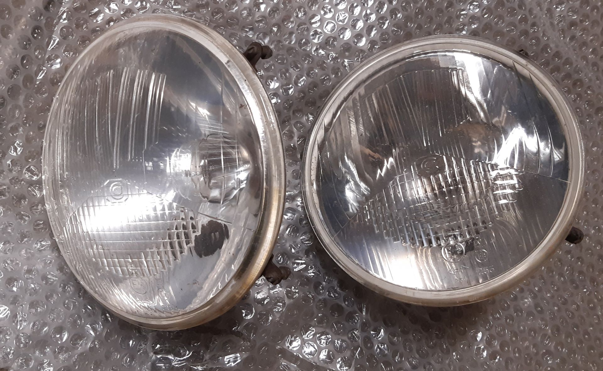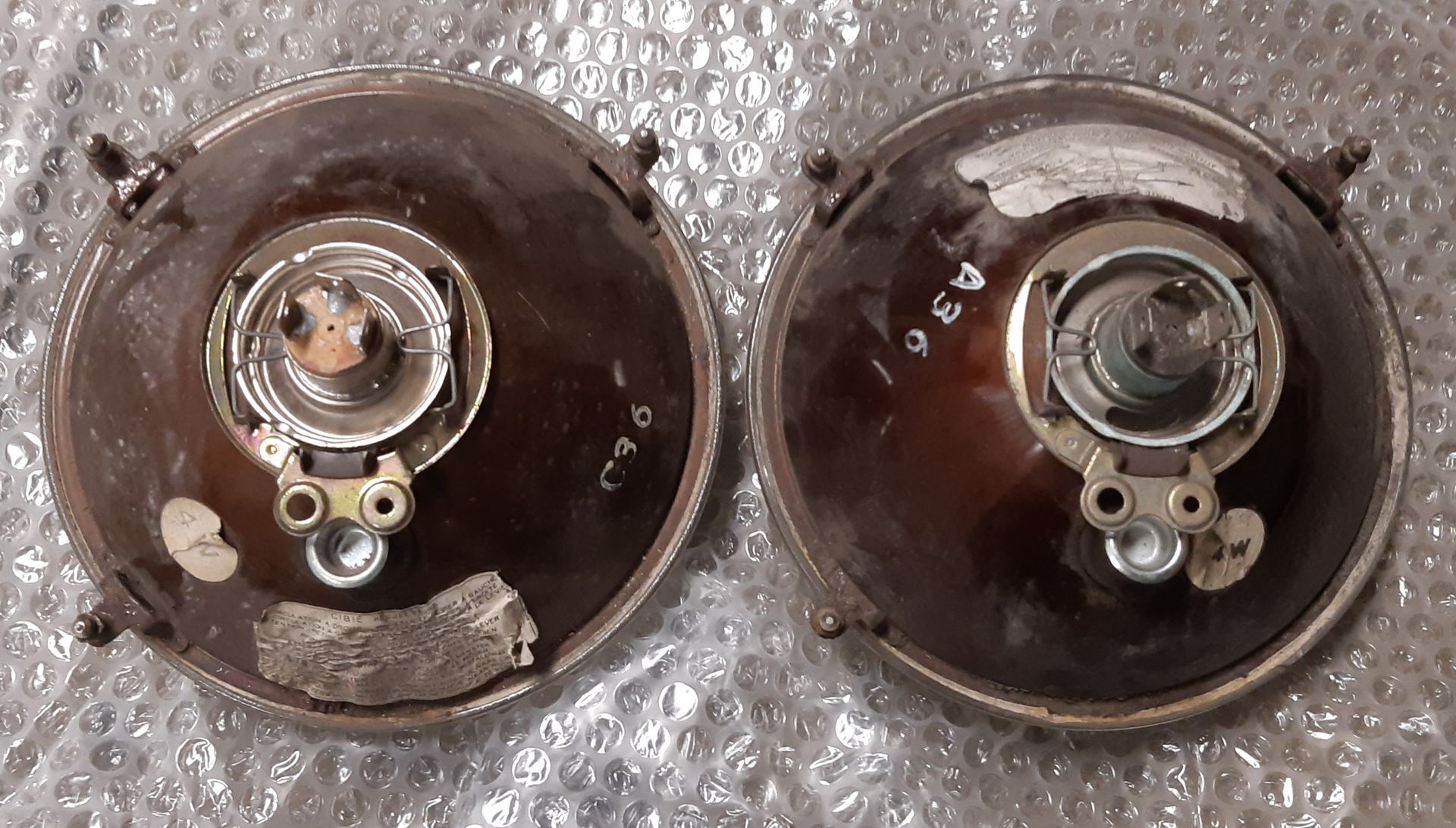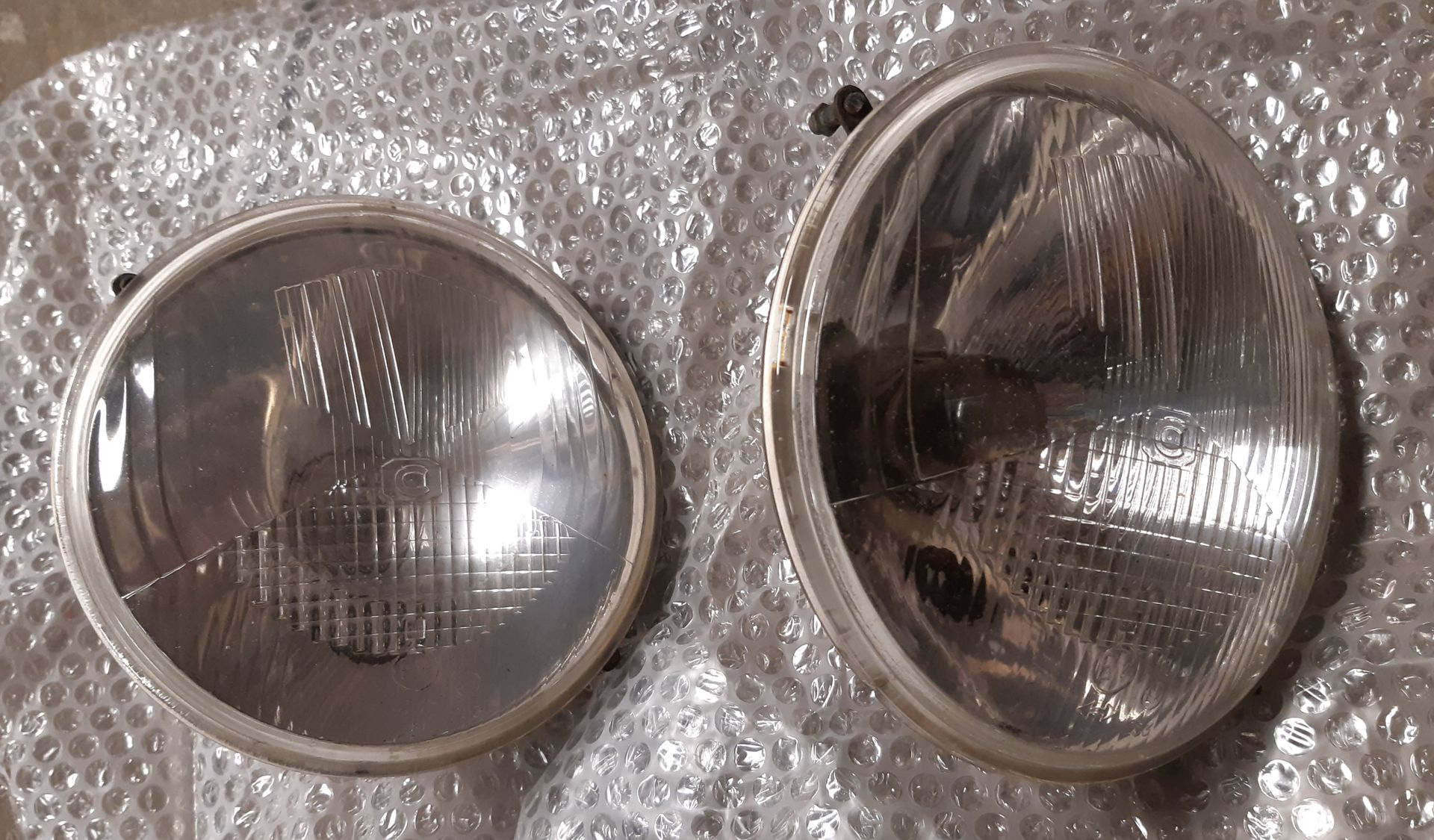 Die Scheinwerfer sind ein bisschen staubig aber die Reflektoren sind noch gut. Es ist die auf Linksverkehr umschaltbare Version. Für Bilux-Lampen, da gibt's ja auch H4-artige mit passendem Fuß für (nicht inkl.).