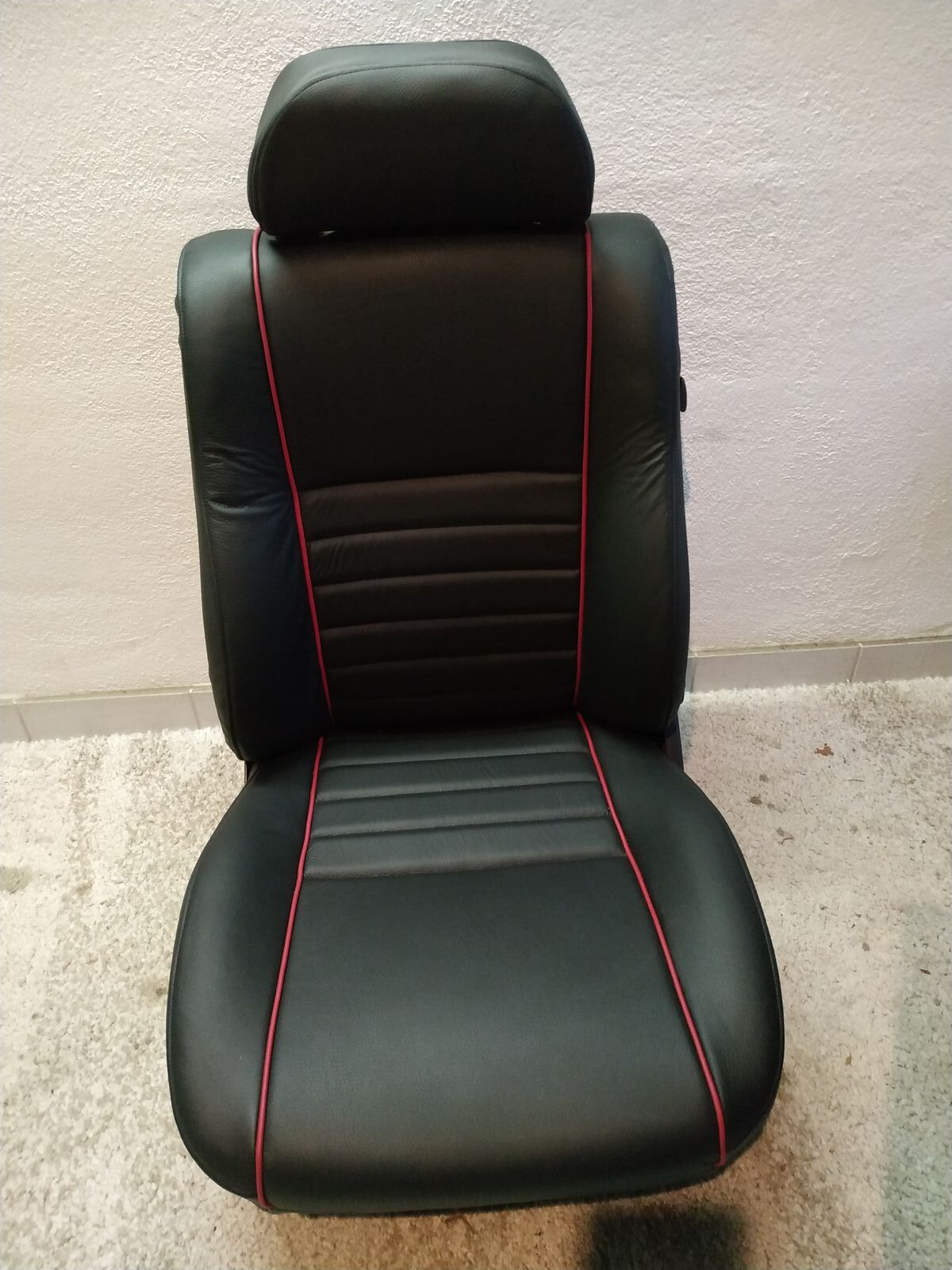 Im Moment in hochwertigem schwarzen Automobilkunstleder mit rotem Keder da. Genau so wie auf dem Bild.