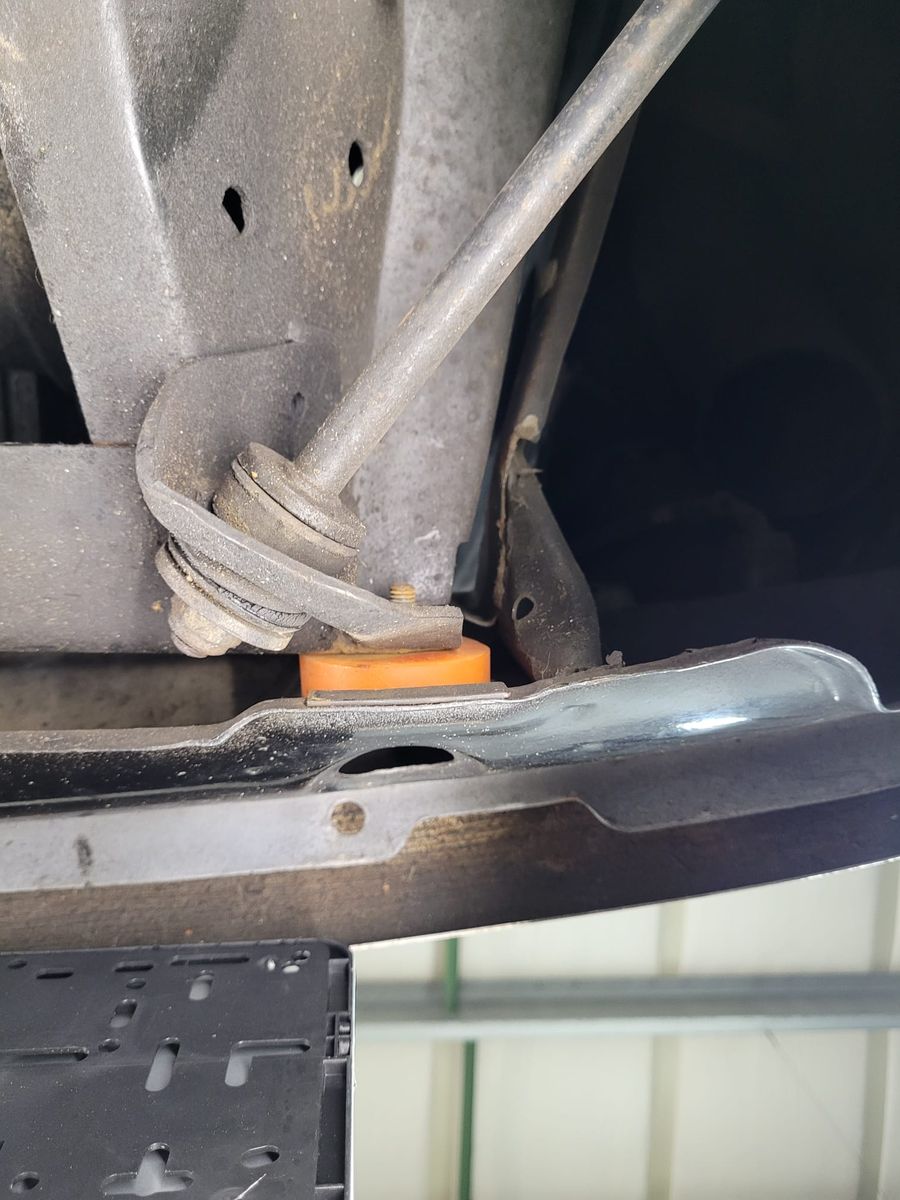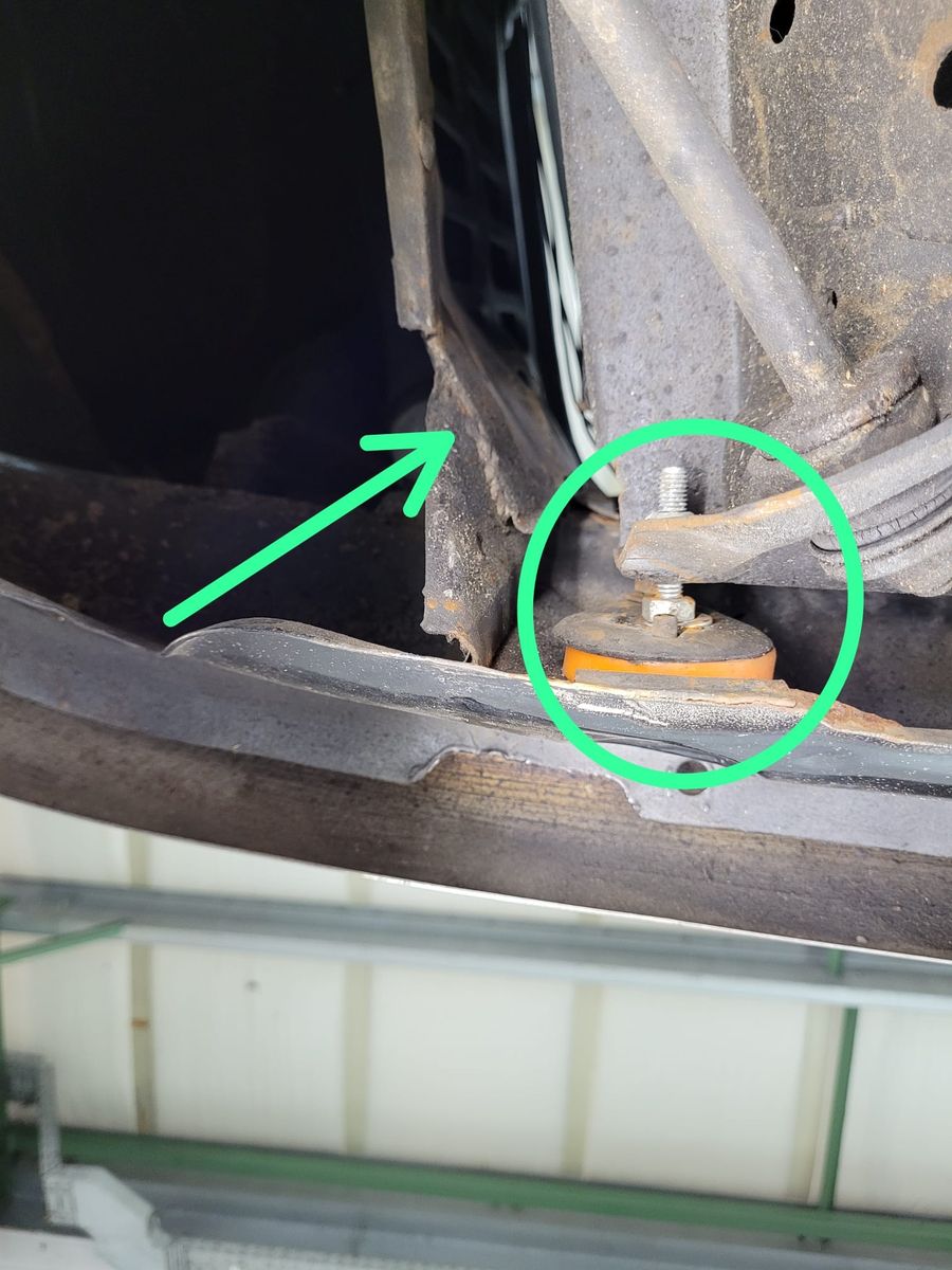 Die vordere Aufnahme links am Vorderachsrahmen hat einen Spalt und liegt nicht an der Karosserie an. Man sieht auch dass das untere Blech der Frontmaske schonmal lackiert wurde.