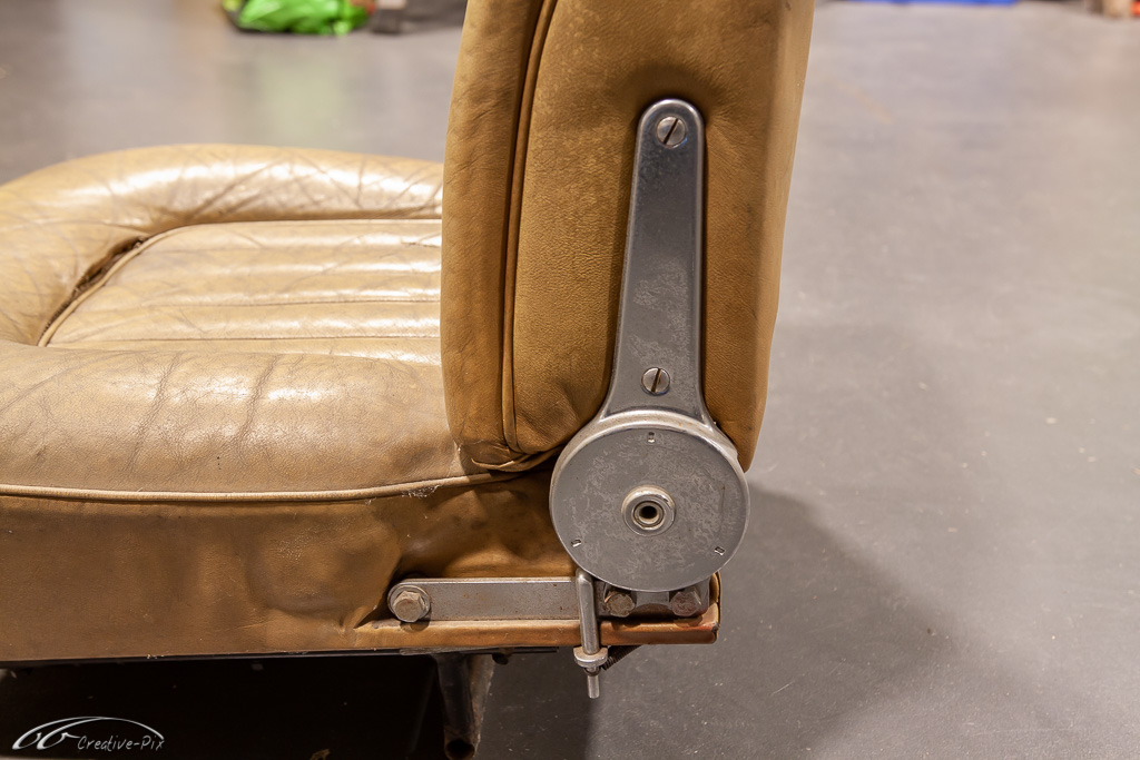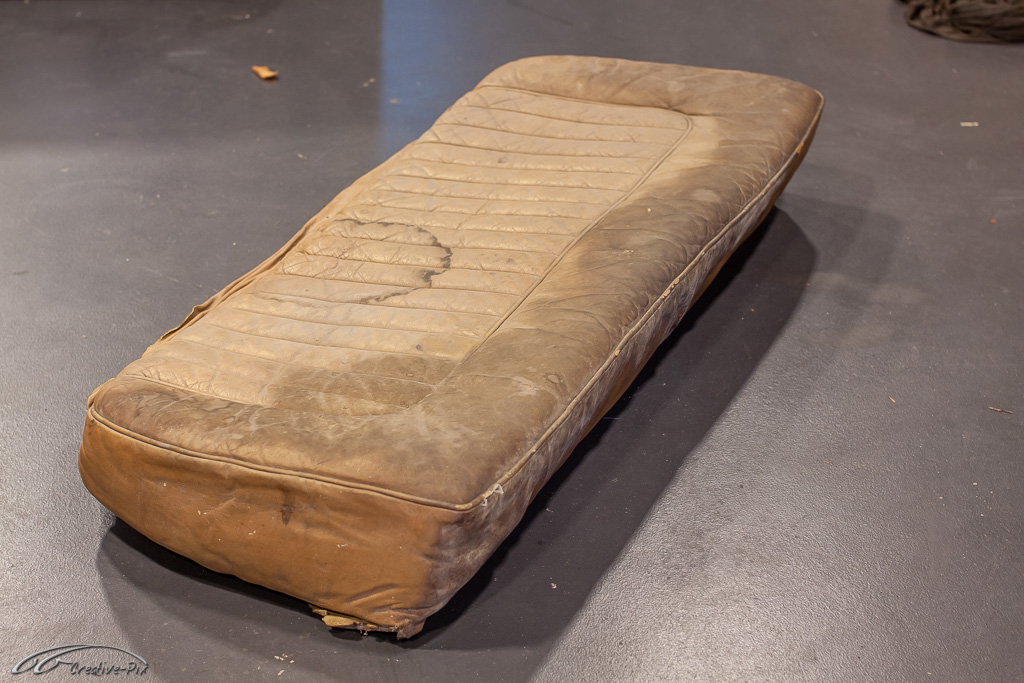 Der rechte Vordersitz bringt aber schon zahlreiche Herausforderungen mit sich. Abgesehen von starker Verschmutzung, ist das Leder total verhärtet und spröde. Gleiches gilt für die Polsterbänder, die eigentlich einen federnden Effekt haben sollten, aber sich in ihrer maximal gedehnten Position verhärtet haben.