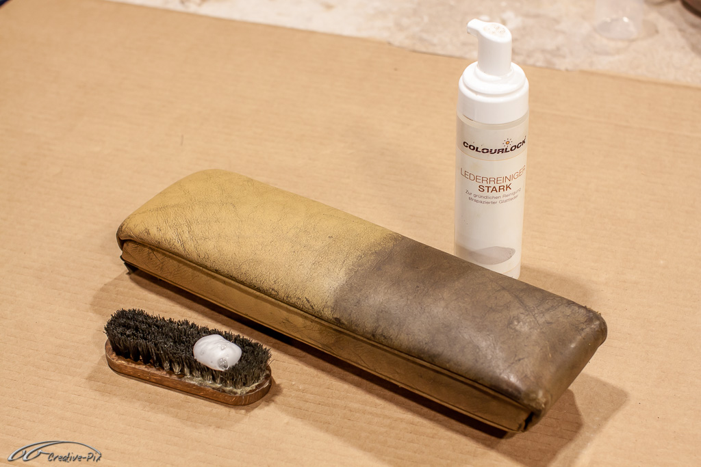 So eine Armlehne ist über die Jahre sämtlicher Art von Schmutz ausgesetzt. Bei allen alten und verbrauchten Sachen kommt irgendwann der Zeitpunkt, wo es den Benutzern egal ist, wie sie damit umgehen. So auch bei der Armlehne. In dem Leder steckt der Dreck von Jahrzehnten. Nach reichlich Recherche habe ich mich für Produkte von Colourlock vom deutschen Lederzentrum entschieden. Sie behaupten, sie verstehen Leder. Na mal sehen ob wir das gleiche Verständnis haben. Mit dem Reiniger bin ich zumindest schon mal ganz happy, der kann zumindest was.