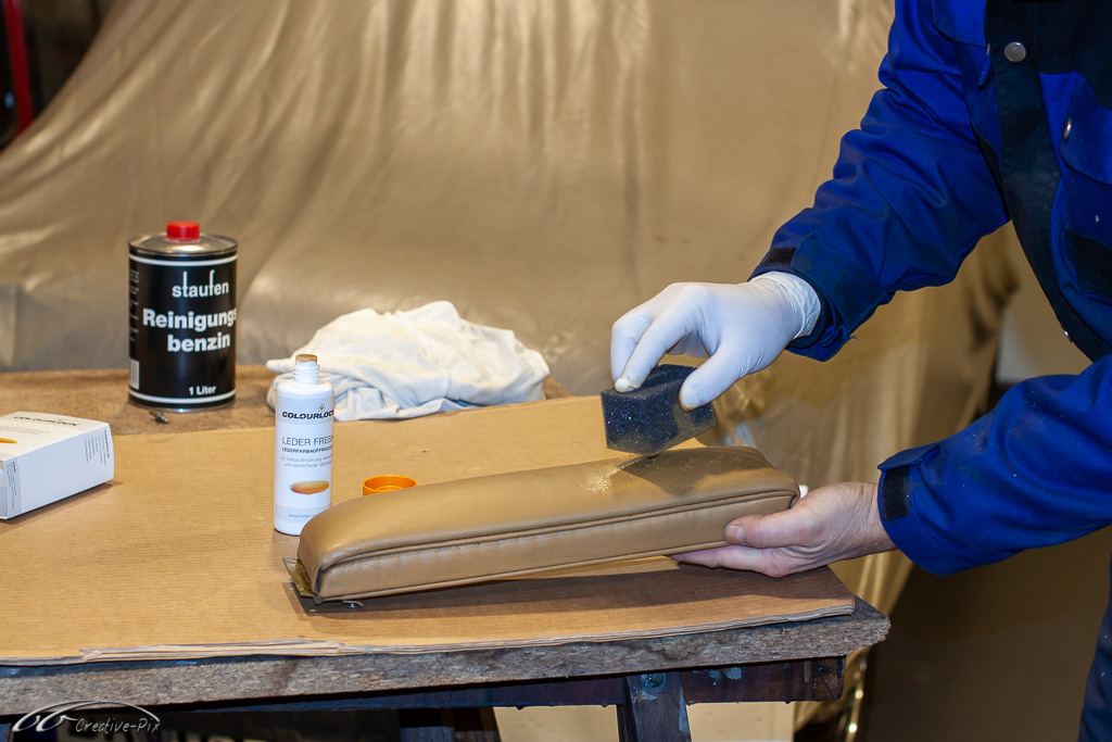 Da gerade im Auflagebereich nur noch wenig originale Farbe übrig ist, geht es nun ans Nachtönen. Man kann das Leder sowohl Lackieren, und damit auch komplett umfärben, oder man kann es tönen. Den passenden Farbton kann man entweder mithilfe einer Farbtabelle ermitteln oder sich nach Muster ebenfalls anmischen lassen. Ich habe ein Musterstück von der Unterseite der Rückbank hingeschickt. Ich bin mir jedoch nicht so klar darüber wie schlau das war, denn auch wenn das der ursprüngliche Farbton war, dann ist das alte Leder doch großflächig verfärbt bzw. ausgeblichen. Also nur ein punktuelles Nachtönen an bestimmten Stellen, so wie es eigentlich für die Tönung gedacht ist, führt damit leider nicht zum Ziel. Verwendet man die Tönung aber in mehreren Schichten, dann entsteht auch wieder ein einheitlicher Farbton. Die Tönung wird sinnvollerweise mit dem Schwamm aufgetupft, um keine Wischspuren zu erhalten und zwischendurch mit dem Heißluftfön getrocknet. Mit dem Ergebnis bin ich absolut zufrieden.