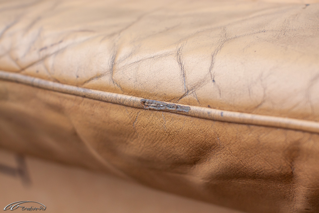 Allerdings sind nun auch die echten Schäden viel deutlicher zu erkennen. Stücke, die aus dem Leder herausgerissen sind, sowie abgestoßene und ausgefranzte Keder Kanten. Hier muss das Flüssigleder wieder zeigen was es kann.