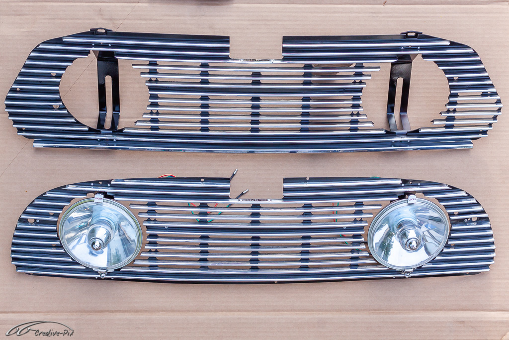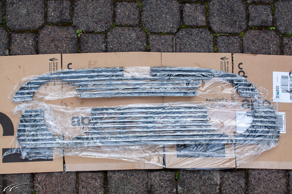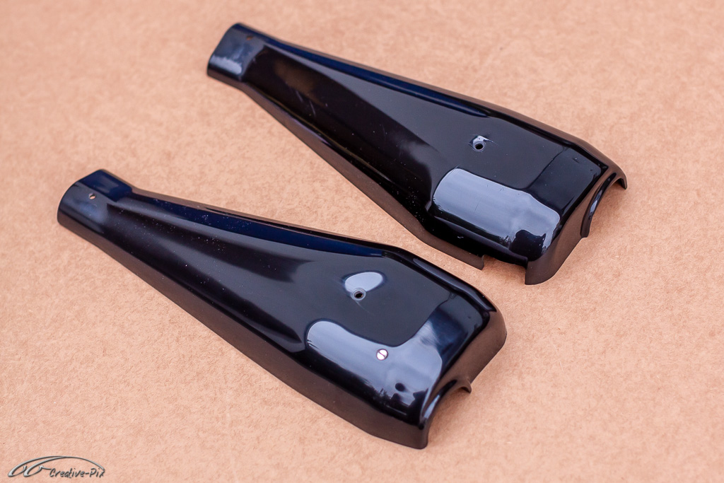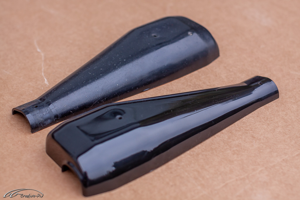 Zum Aufarbeiten der Verkleidung bin ich den traditionellen Weg gegangen. Erst gründlich gereinigt, dann in verschiedenen Steps nass geschliffen, von 400er bis 2000er Papier, um sie abschließend mit Lackreiniger wieder zum Glänzen zu bringen. Hier erst einmal der Vergleich. Die obere Hälfte noch unbehandelt, die untere Hälfte schon fertig aufgearbeitet.