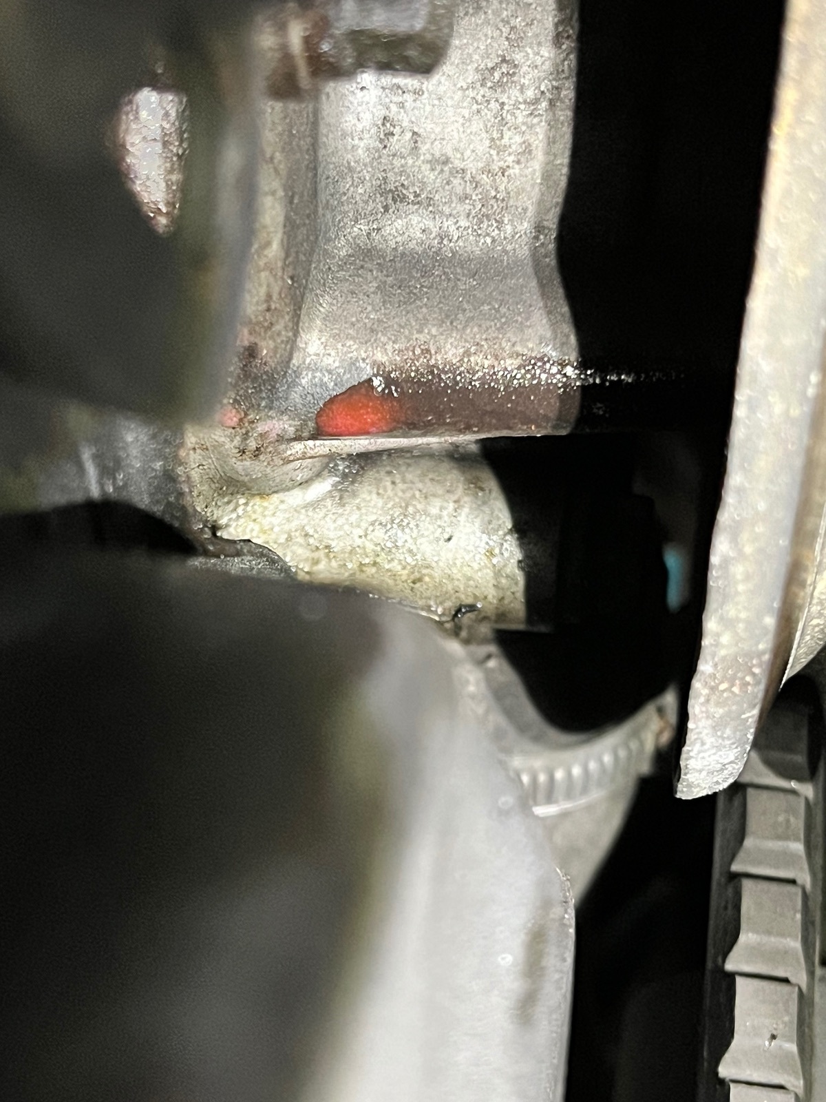 Es ist schlecht zu sehen, wo es her kommt, aber es sieht so aus, als sei der höchste nasse Punkt die Wasserpumpe. Das einzige was mich jetzt wundert ist, dass es von der Seite des Kühlers her an der Unterseite der Wasserpumpe her zu laufen scheint. Wenn die Wasserpumpe undicht ist hätte ich eher erwartet dass es von der Seite des Motors her kommen würde.