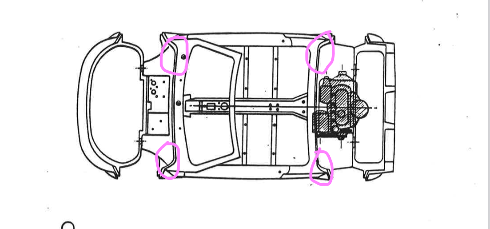 genau da hebe ich meinen MK1 Rossa auch mit dem Wagenheber an. Bei den Hauptuntersuchungen wurde der Gtm, wenn er denn angehoben wurde, auch an diesen vier Punkten angehoben.
