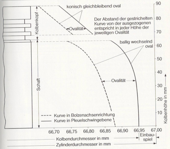 Ein Kolben ist nicht kreisrund, sondern eher ein Oval (bei Zimmertemperatur) und das ändert sich auch nocht über die Länge des Schafts. Das hat mit der Ausdehnung des Materials zu tun, denn diese ist nicht gleich über das ganze Volumen, und von oben bis unten ist zusätzlich eine unterschiedliche Temperaturverteilung. Außerdem dehnen sich Alu-Kolben mehr als z.B. Stahlkolben für manche Diesel-Autos. Die Kolbenhersteller berücksichtigen das in den Dimensionen ihrer Kolben.