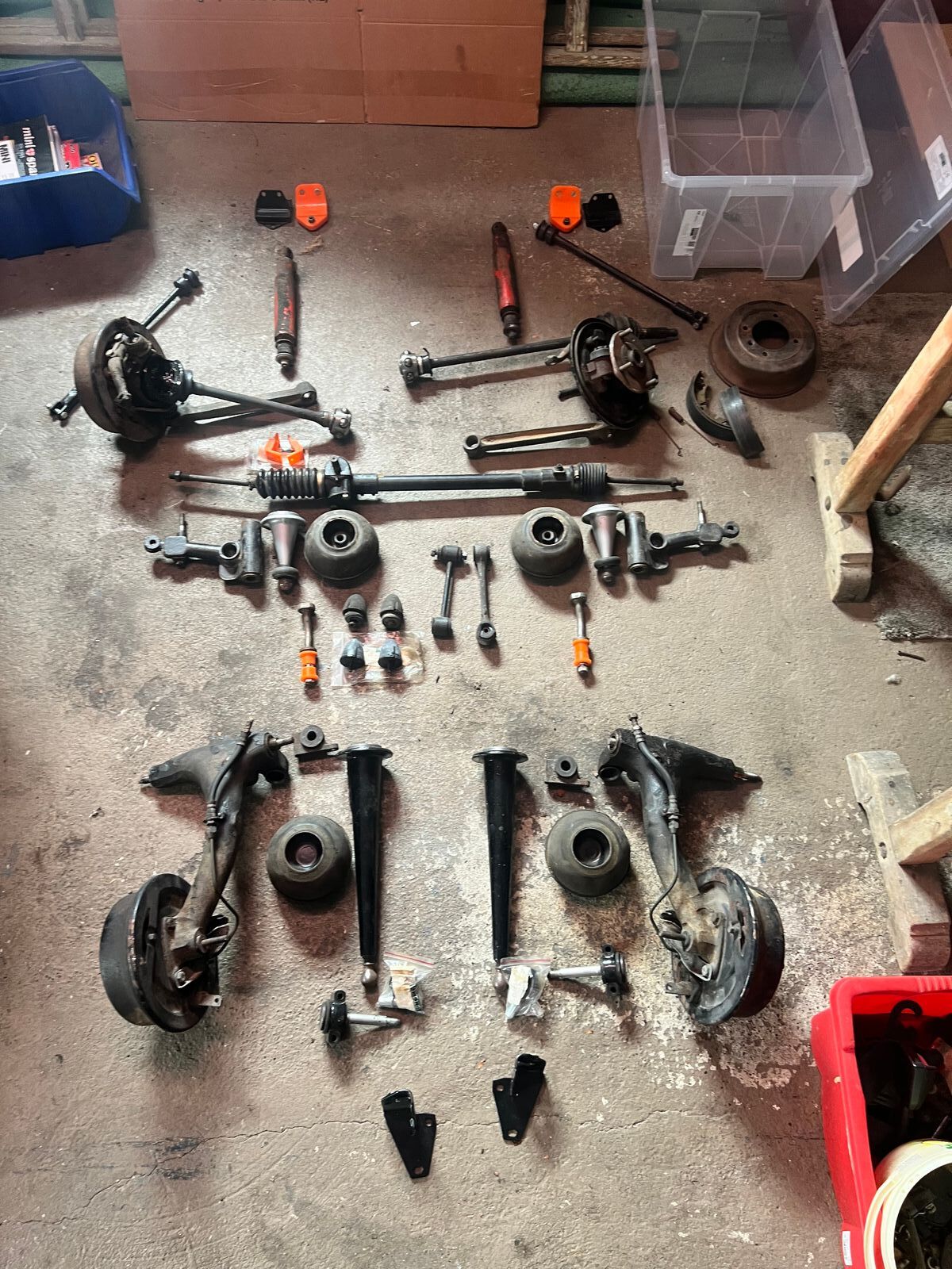 Da das Auto rostmäßig in so gutem Zustand ist, die Hilfsrahmen bereits gestrahlt und pulverbeschichtet wurden und sonst die meisten Teile vorhanden sind, möchte ich mich einerseits mechanisch austoben, andererseits erste Schritte zum Thema Schweißen an dem Auto ausprobieren. Ich möchte ihn sehr sportlich abstimmen, eventuell etwas erleichtern und im späteren Verlauf auch am Motor arbeiten. Zuerst steht jedoch der Wiederaufbau des Fahrwerks im Vordergrund.