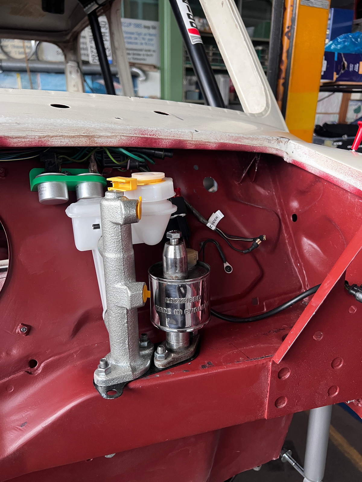 Bevor die großen schweren Teile (Die übrigens NICHT im Cooper S sondern zwecks Platzproblemen im Mondeo Kombi transportiert wurden) an den Mini konnten, mussten natürlich noch einige Vorbereitungen getroffen werden. Also die Lenksäule samt Pedalerie einmal rein und zum ersten Mal gab es auch die dazugehörigen Zylinder.