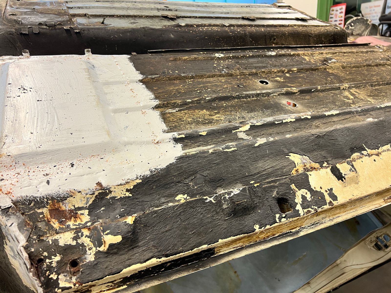 Nachdem ich die ungefähr 3 Millionen Schweißpunkte entlang des Schwellers entdeckt habe, war das Schweller sauber aufbohren leider schonmal raus. Daher wurden die unteren Punkte aufgebohrt und der Schweller am oberen Ende abgeflext und das übrige Blech per Schruppscheibe gesäubert.