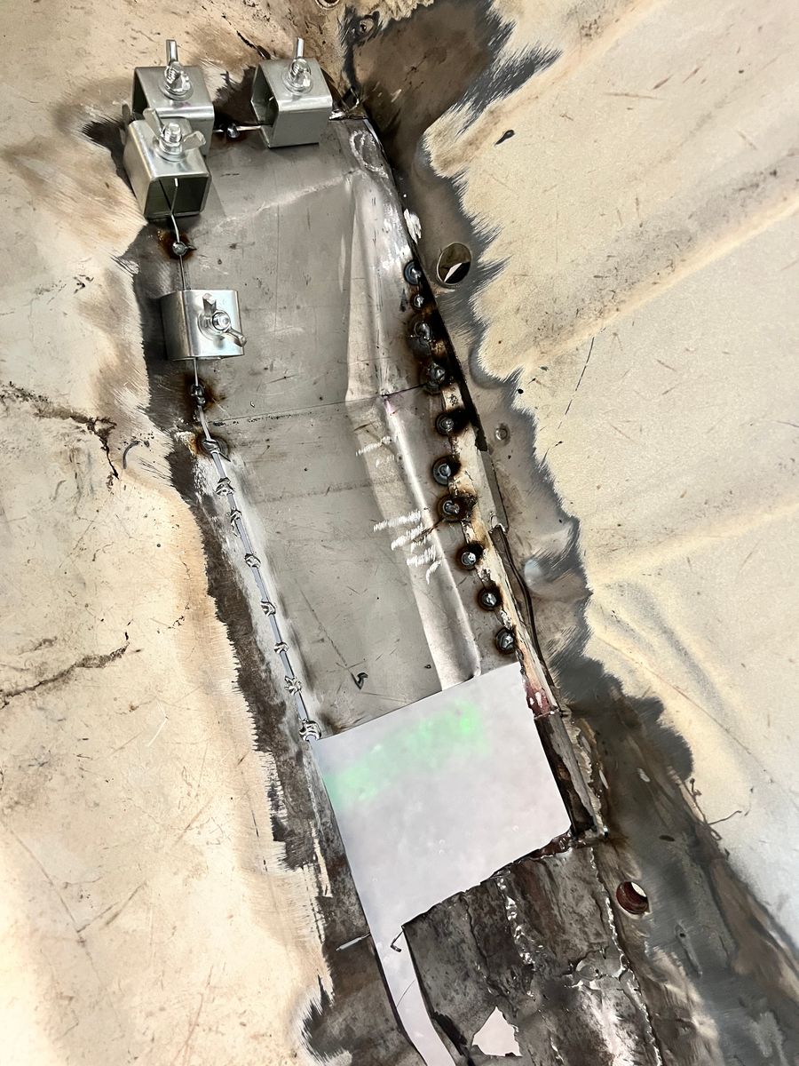 Die im Dezember abgedeckten Stellen wurden zuerst wieder blank gemacht, dann über zwei Tage mit Rostumwandler behandelt und schlussendlich final abgeschliffen und grundiert! Zwischendurch wurden noch kleinere Löcher zugeschweißt.