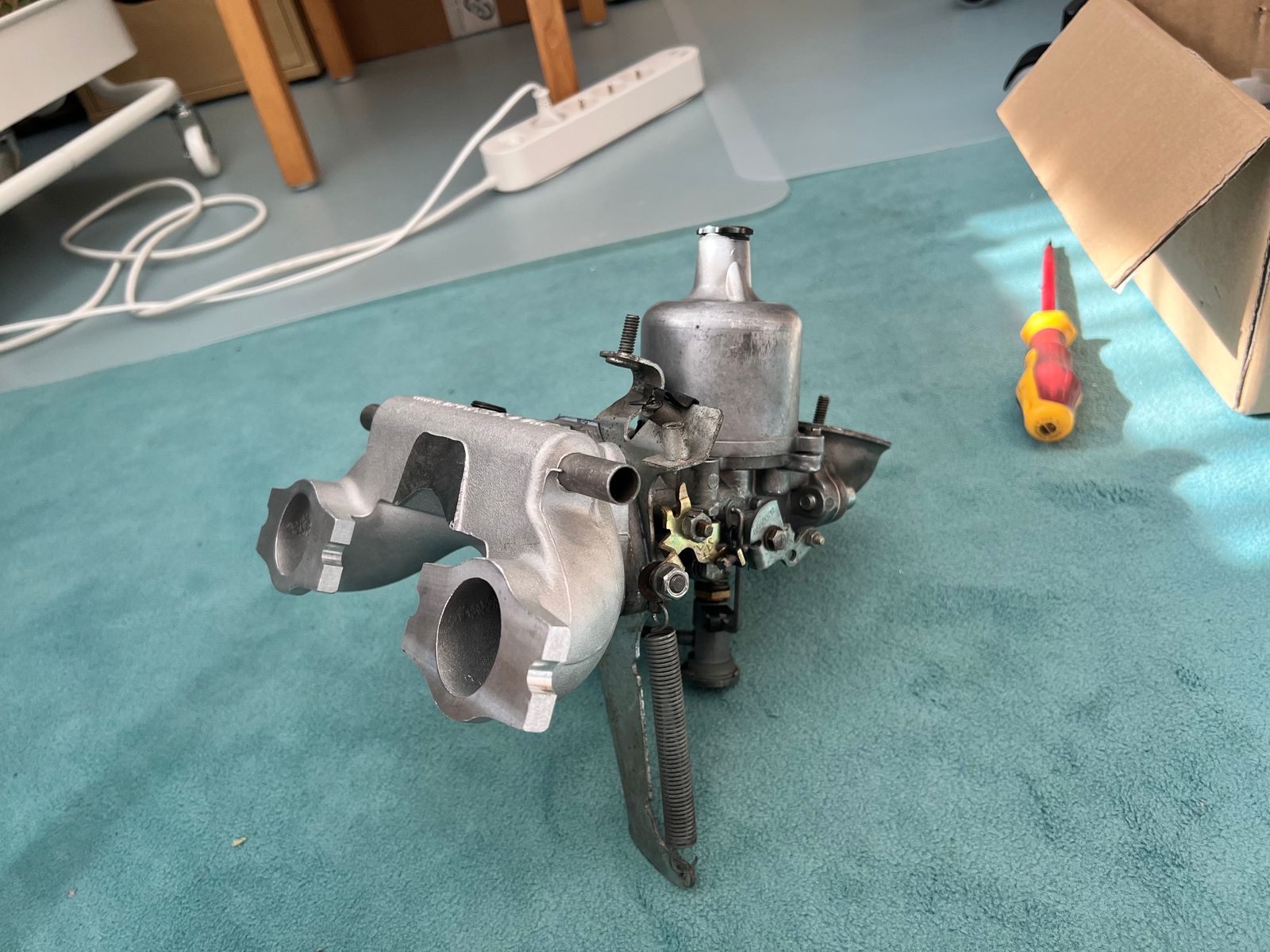 Nachdem mir David dankenswerterweise sowohl Schraube als auch Feder des Hs4 Vergasers geschickt hat, und ich die Unterlegscheibe, die vermutlich für den schlechten Sitz verantwortlich war, entfernt habe, funktionier der Vergaser problemlos! Ich hab es mir also nicht nehmen lassen das ganze Konstrukt einmal zusammenzubauen und in das Regal zu stellen! :D