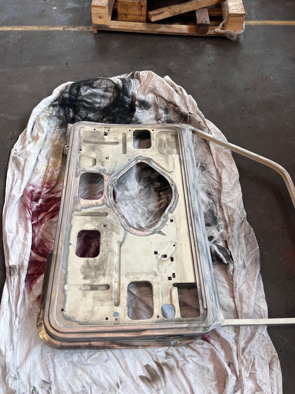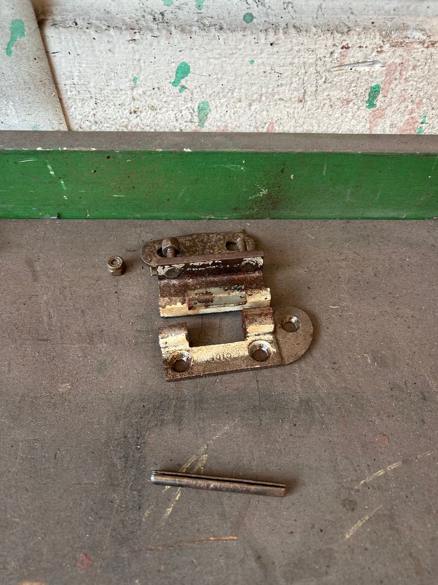 Die Türscharniere waren ziemlich schwergängig, weswegen sie für mehrere Tage in WD40 eingelegt wurden, bevor die Splinte mit einer dafür zurecht geflexten Schraube ausgetrieben wurden. Dann einmal alles gebürstet, gereinigt und passend für die Weiterverarbeitung fixiert.