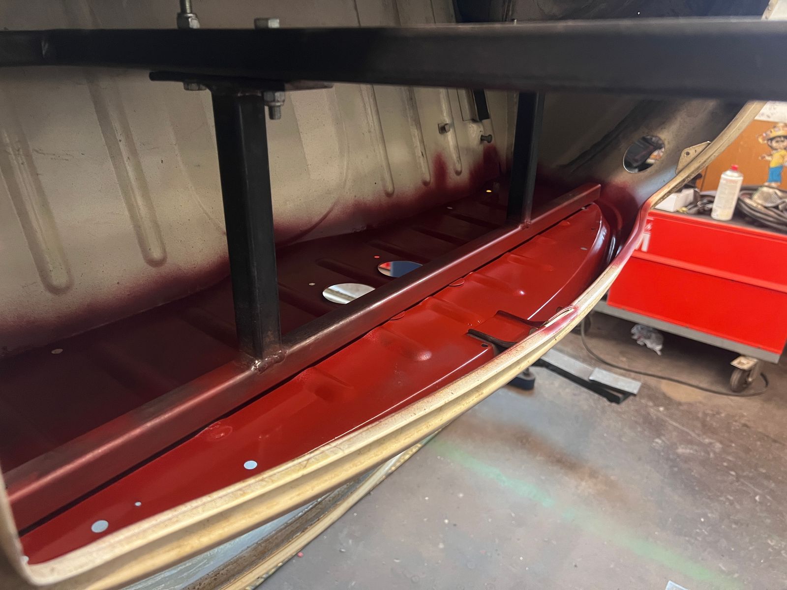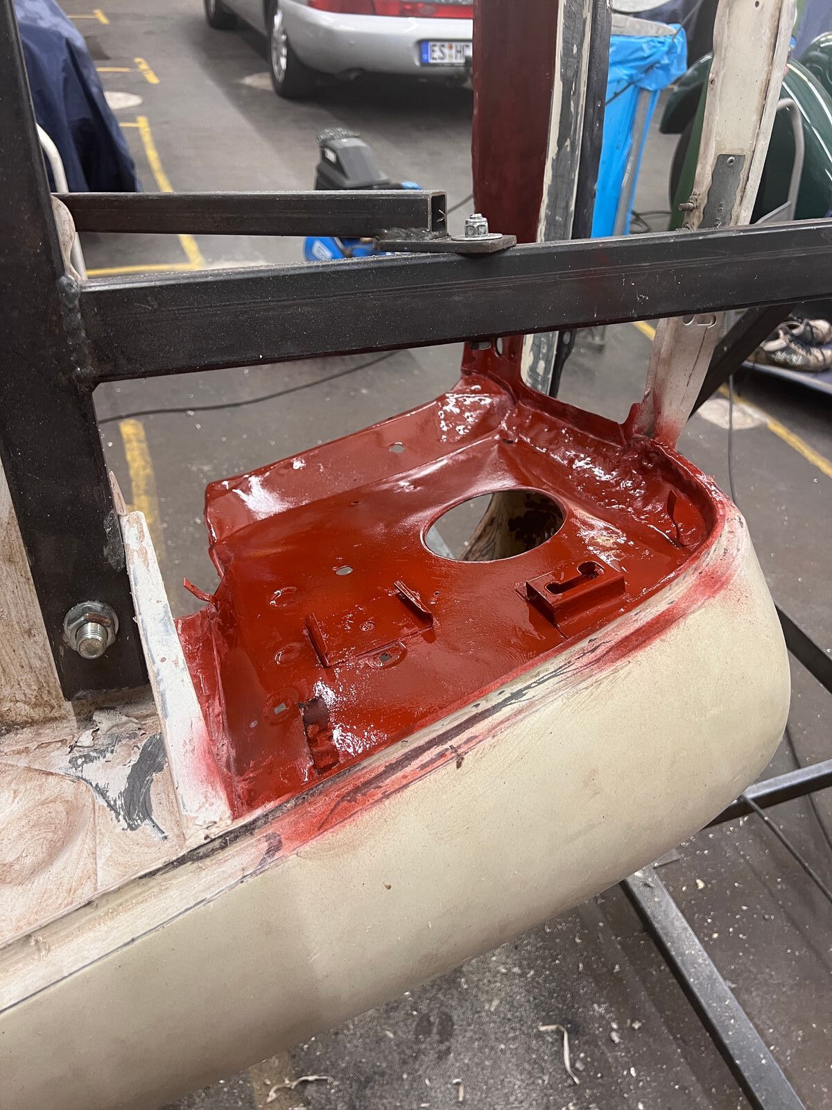 Eine Kleinigkeit hat es mir dann doch noch gereicht, die Unterseite der Hutablage hatte noch einige Rostpickel, gleiches Spiel wie überall, Drahtbürste, Reinigungsscheibe, Rost-Stop Grundierung, tada: