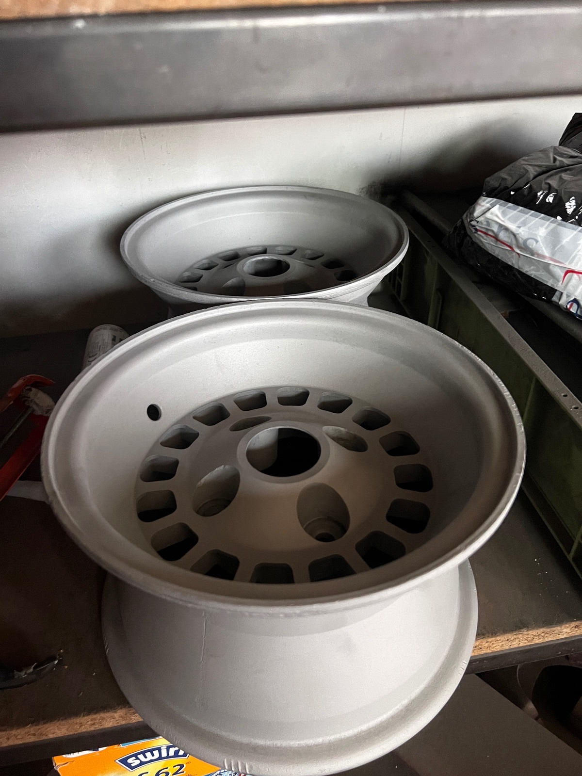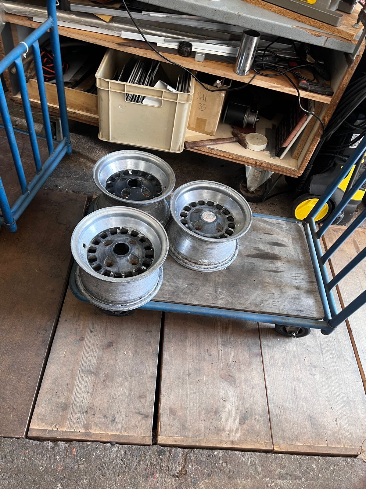 Die Felgen waren die letzten zwei Wochen beim sandstrahlen. Gestern habe ich sie abgeholt und zu der befreundeten Poliererin gebracht, die sich jetzt ans Werk macht und den Ring schleift und poliert, bevor die Felgen final zum Lackierer gehen.