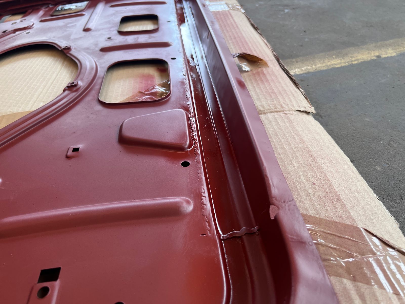 Final noch eine Schicht Grundierung drüber und bereit für die neue Türhaut! Die beiden Türhäute wurden spaßeshalber mal draufgelegt, hier zahlt es sich wirklich aus, dass ich bis jetzt nur Heritage-Bleche benutzt habe, die neuen passen wie angegossen.