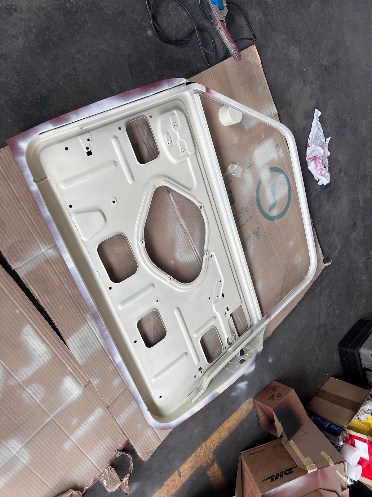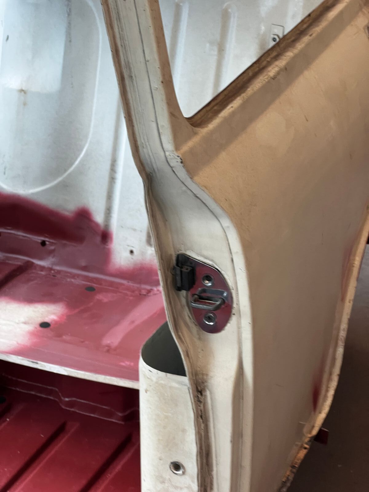 Natürlich gab es zum Abschluss noch eine Runde Grundierung, und anschließend für die Innenseiten beider Türen eine dick aufgetragene Schicht NMF BMC Arum White aus der Dose, um den Rostschutz in der Tür auch mit aufgesetzter Türhaut zu gewährleisten.
