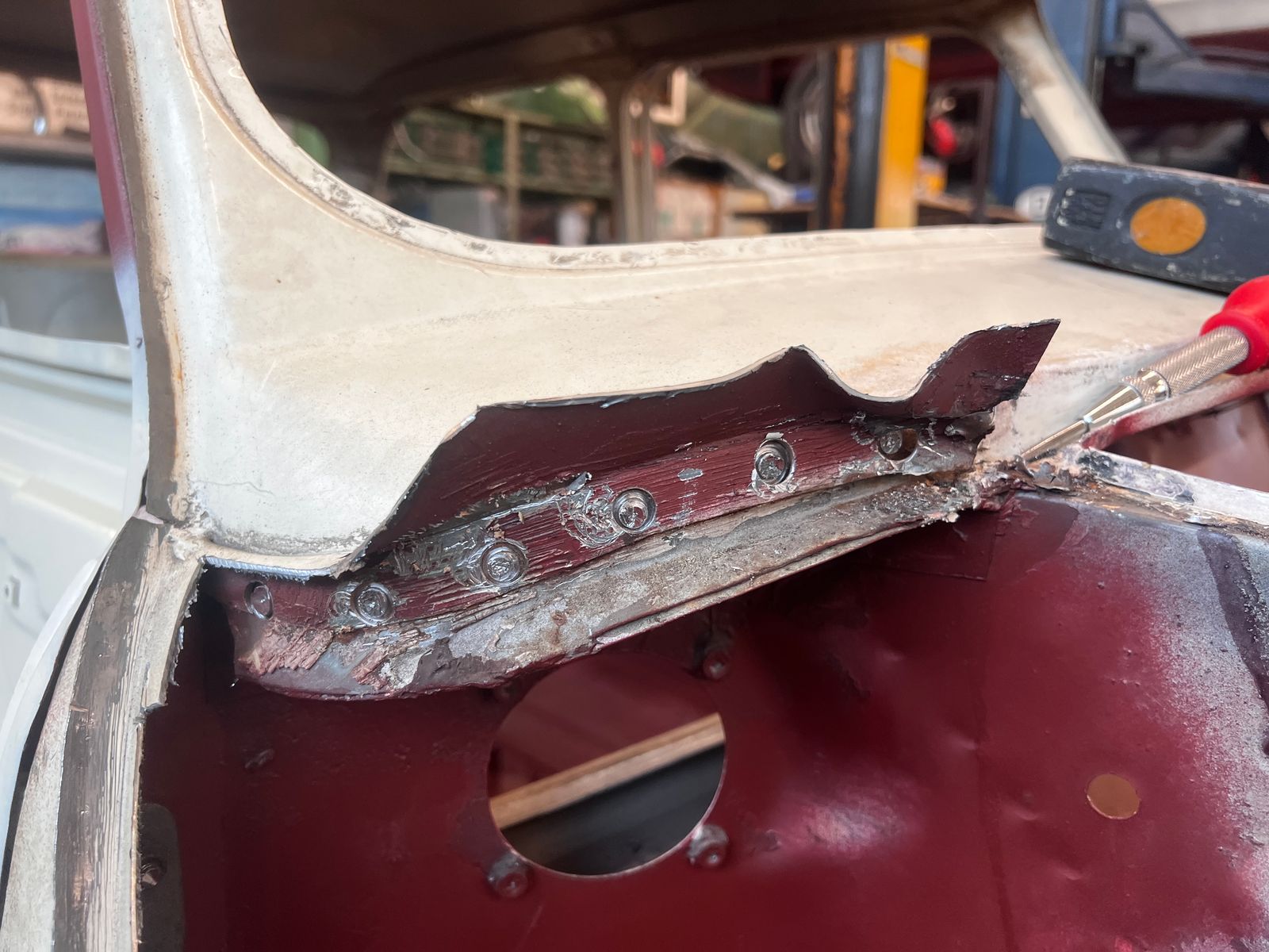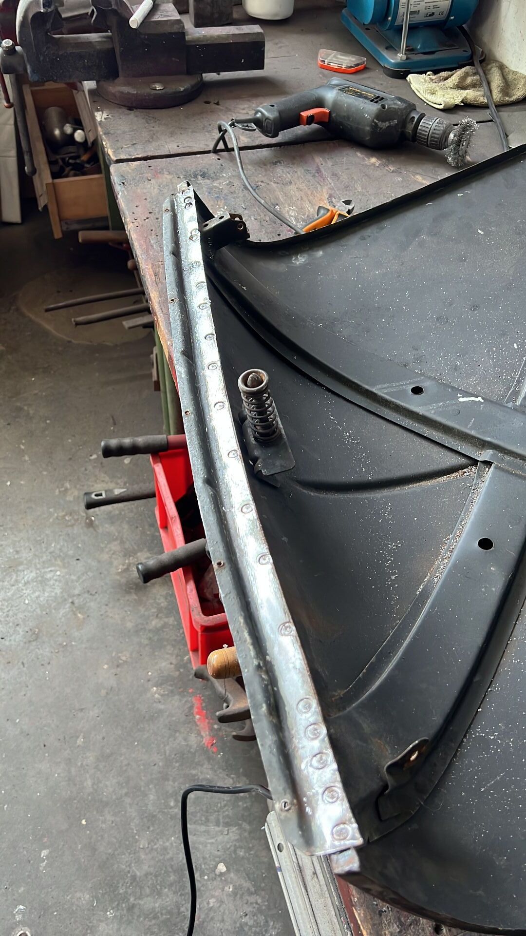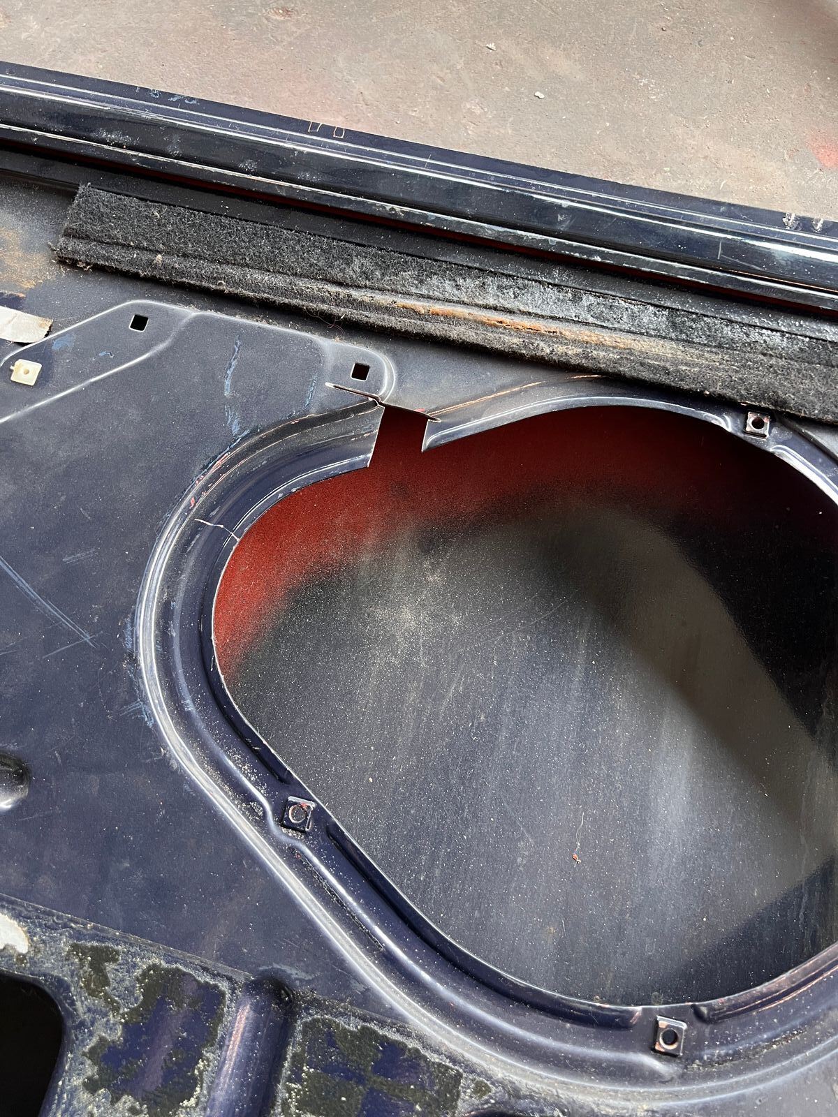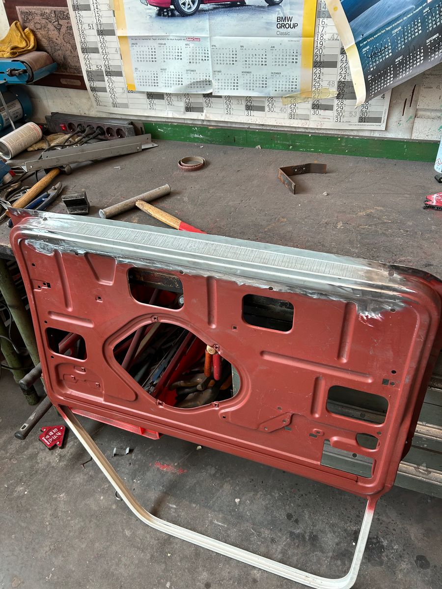 Nachdem das erledigt war, reparierte er noch eine Stelle an der Außenkante, an der das Blech so dünn war, dass es beim Türhaut abnehmen leider eingerissen wurde.