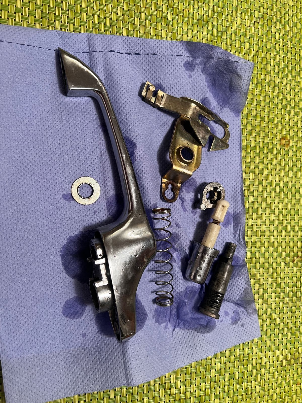 Da der Mini original als City 1000 vom Band lief, kam er serienmäßig – neben dem trüben, hellgrauen 80er-Jahre-Teppich – auch mit grau lackierten Türgriffen daher. Da selbst mein Vorbesitzer kapiert hatte, dass das so nicht in Ordnung ist, hatte er bereits ein gebrauchtes Paar Chrom-Türgriffe gekauft – allerdings ohne Schlüssel...Also wurden erstmal alle vier Türgriffe zerlegt. Die Schlosszylinder habe ich von den grauen in die Chromgriffe übernommen, alles gründlich im Ultraschallbad gereinigt, wieder zusammengebaut, etwas gefettet und zum Schluss nochmal ordentlich poliert. Shiny.