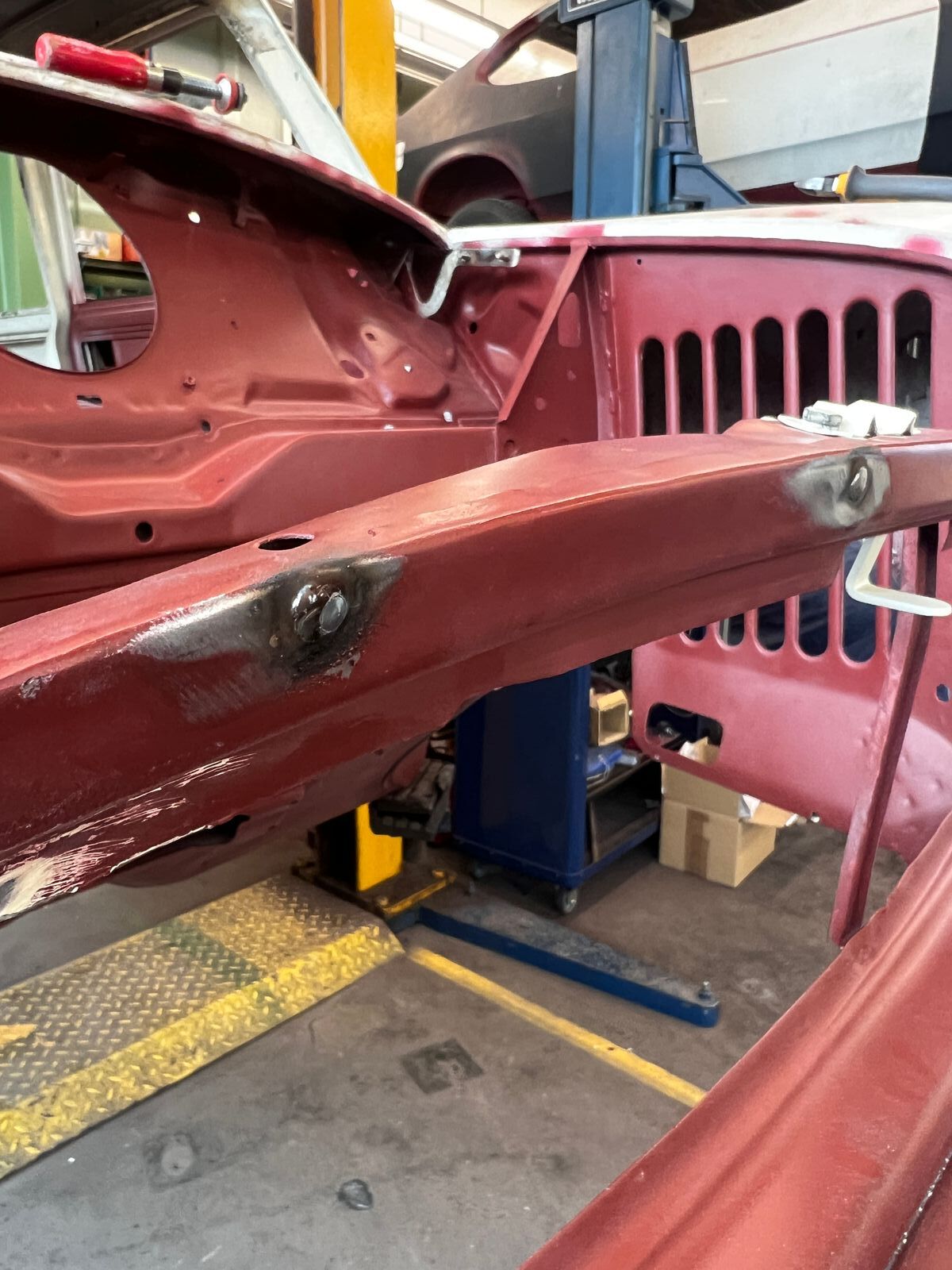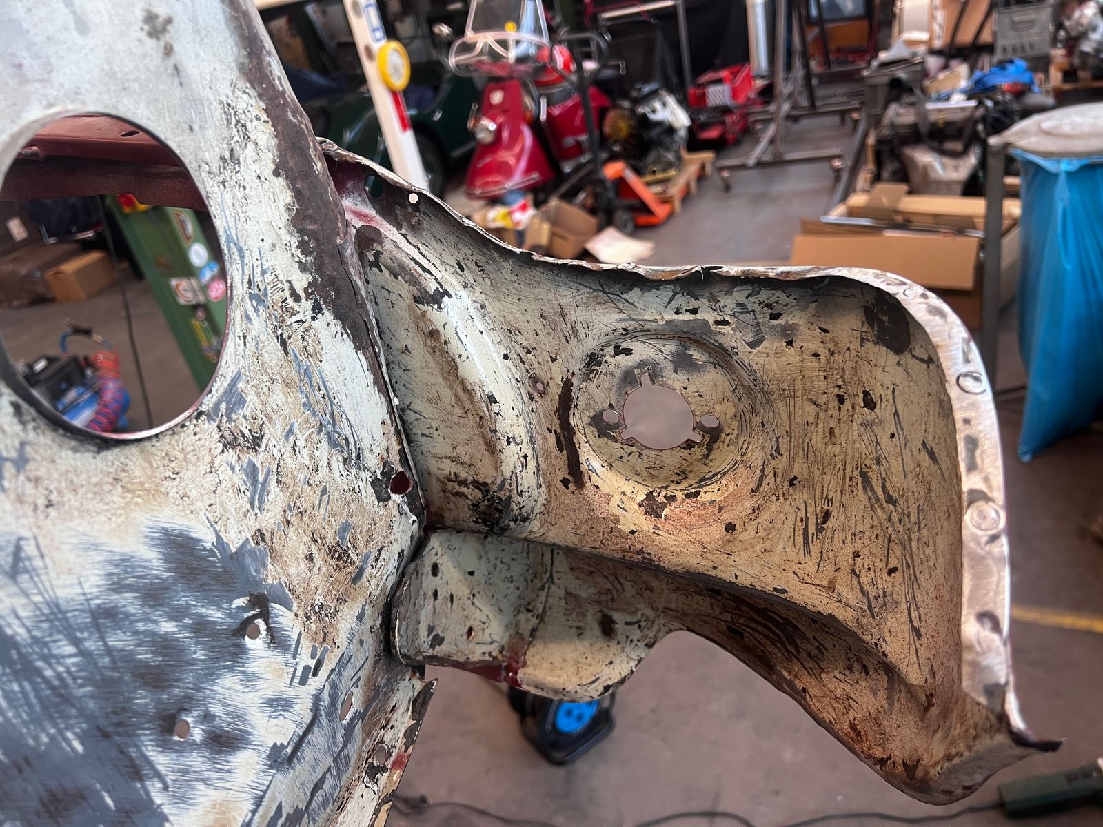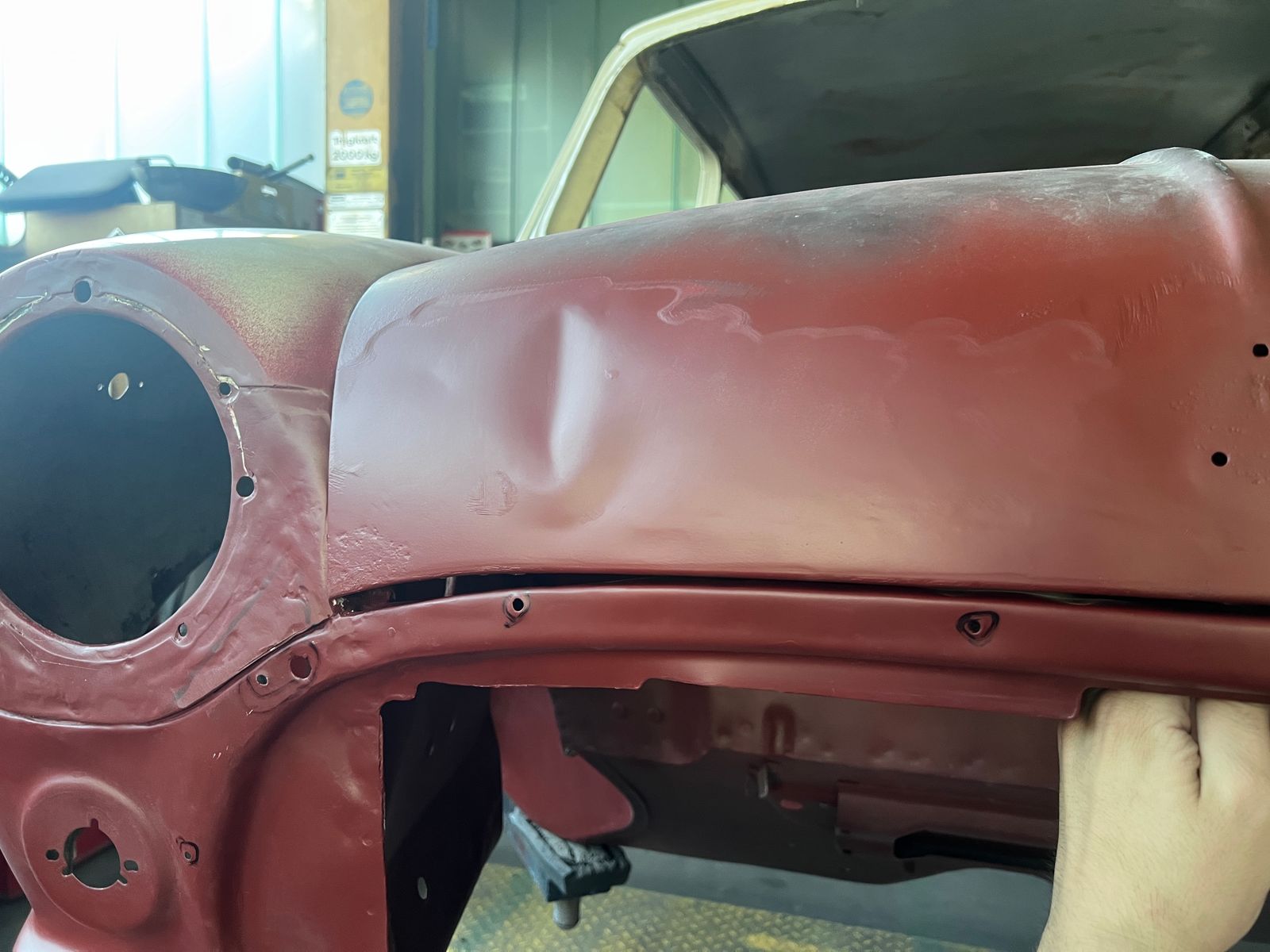 Mal davon abgesehen, dass unter einer fetten Spachtelschicht nochmal eine Delle des vermuteten Unfalls auf der Motorhaube hervorkam, ist die Passform trotz eingestellten Scharniere rechts quasi nicht vorhanden. Egal wie weit man die Motorhaube nach hinten einstellt, sie steht 2-3 cm zu weit nach vorn und die Biegung der Frontmaske folgt nicht der der Haubenkante. Die aktuelle These ist, dass der Unfall nicht nur den Kotflügel beschädigt, und eine fette Delle in der Haube hinterlassen, sondern die gesamte rechte Front ca. 2-3 cm nach hinten und etwas nach unten verschoben hat. Als jemand der noch nie einen Mini komplett restauriert hat, ist mir das bisher nicht weiter aufgefallen, aber im Vergleich mit der Gegenüberliegenden Seite wirkt dieser Knick hier etwas fehl am Platz:
