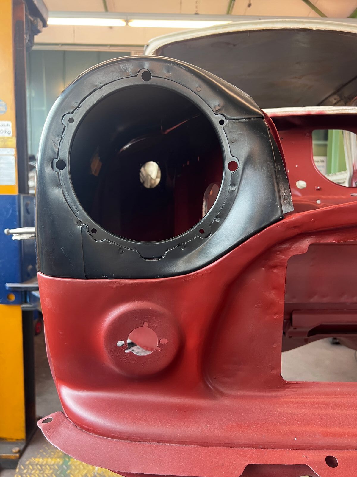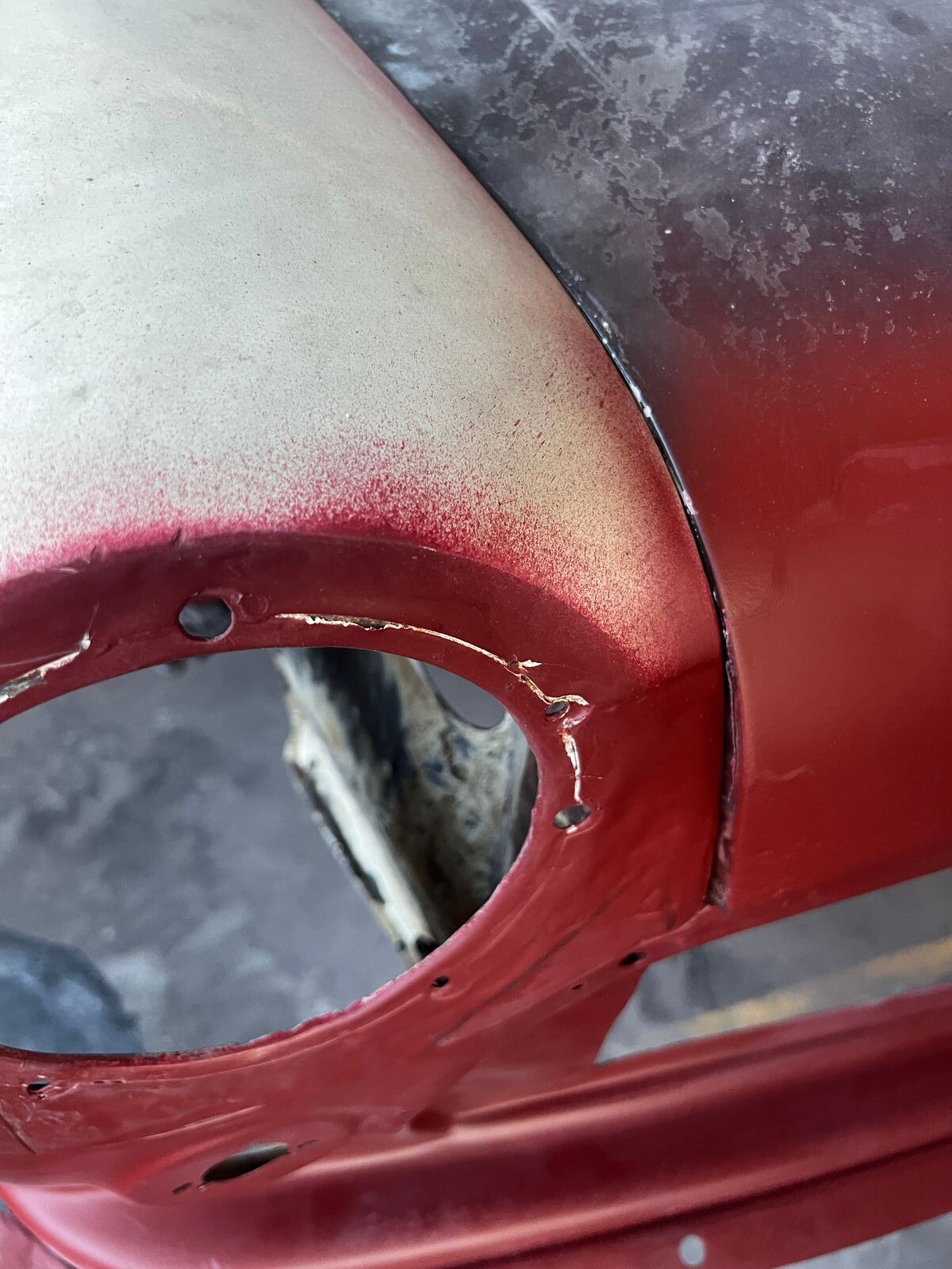 Bevor der Kotflügel ran kann, mussten noch einige Löcher geschlossen werden. Einerseits die Löcher in der Front für den Mk2 Kühlergrill, andererseits zwei größere Löcher in der Front deren Zweck mir bis heute nicht ganz klar ist, sowie die Löcher des herausgebohrten Aschenbechers. Vielleicht weiß ja jemand von euch wofür die größeren Löcher ursprünglich gedacht waren? Zusatzscheinwerfer dürfte er nie gehabt haben.