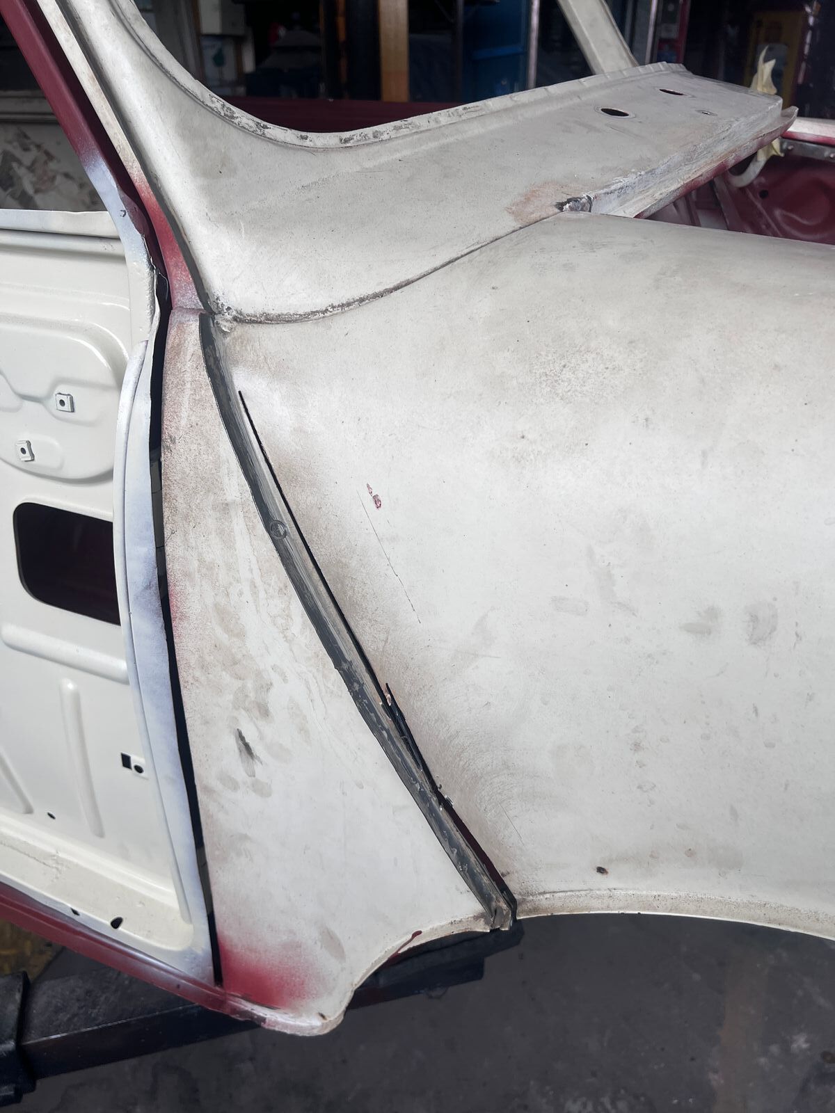 Eine Runde mit der Reinigungsscheibe und etwas Feinarbeit mit dem Dremel später, bekam der Türrahmen vor allem auf der Seite zur Türhaut eine komplette Grundierung mit Rost-Stop, um zukünftigen Rost etwas zu erschweren. Eine vom Vorbesitzer rausgetrennte Stelle am Falz unten muss noch neu eingeschweißt werden, da noch einige Rostlöcher drin sind nehm ich wohl sogar etwas mehr Material ab.
