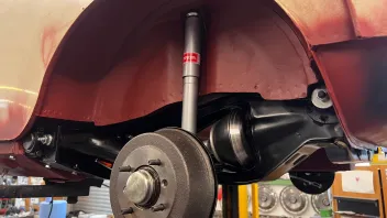 Wir entschieden uns vor dem vorderen Hilfsrahmen als Gegengewicht erst den hinteren Hilfsrahmen am Auto anzubringen. Nach einigen Versuchen, den Rahmen samt Schwingen am Auto zu befestigen mussten wir uns geschlagen geben und die Schwingen samt Bremsleitungen und Handbremsseil doch demontieren, da man die vorderen Schrauben sonst nicht am einstellbaren Bracket vorbei angezogen bekommt. Doof, aber lieber jetzt lernen und beim finalen Aufbau dann wissen.