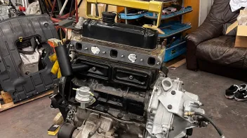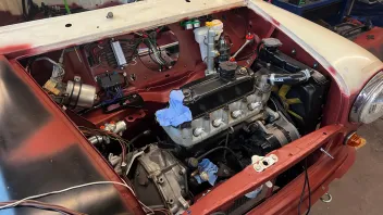 In der Halle in der ich schraube gibt es einen alten Deckenkran, ich war also guter Dinge den Motor alleine einbauen zu können. Pustekuchen. Nach einem ganzen Abend, an dem ich unter anderem auf dem Motor samt Hilfsrahmen auf und ab gesprungen bin, verschiedene Einbau- Reihenfolgen ausprobiert habe und final diverse verbale Angriffe auf das Konstrukt gestartet hatte, gab ich klein bei. Es war wirklich schwieriger als gedacht auf beiden Seiten die Schraublöcher mit den Löchern des Hilfsrahmens in eine Reihe zu bekommen.