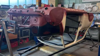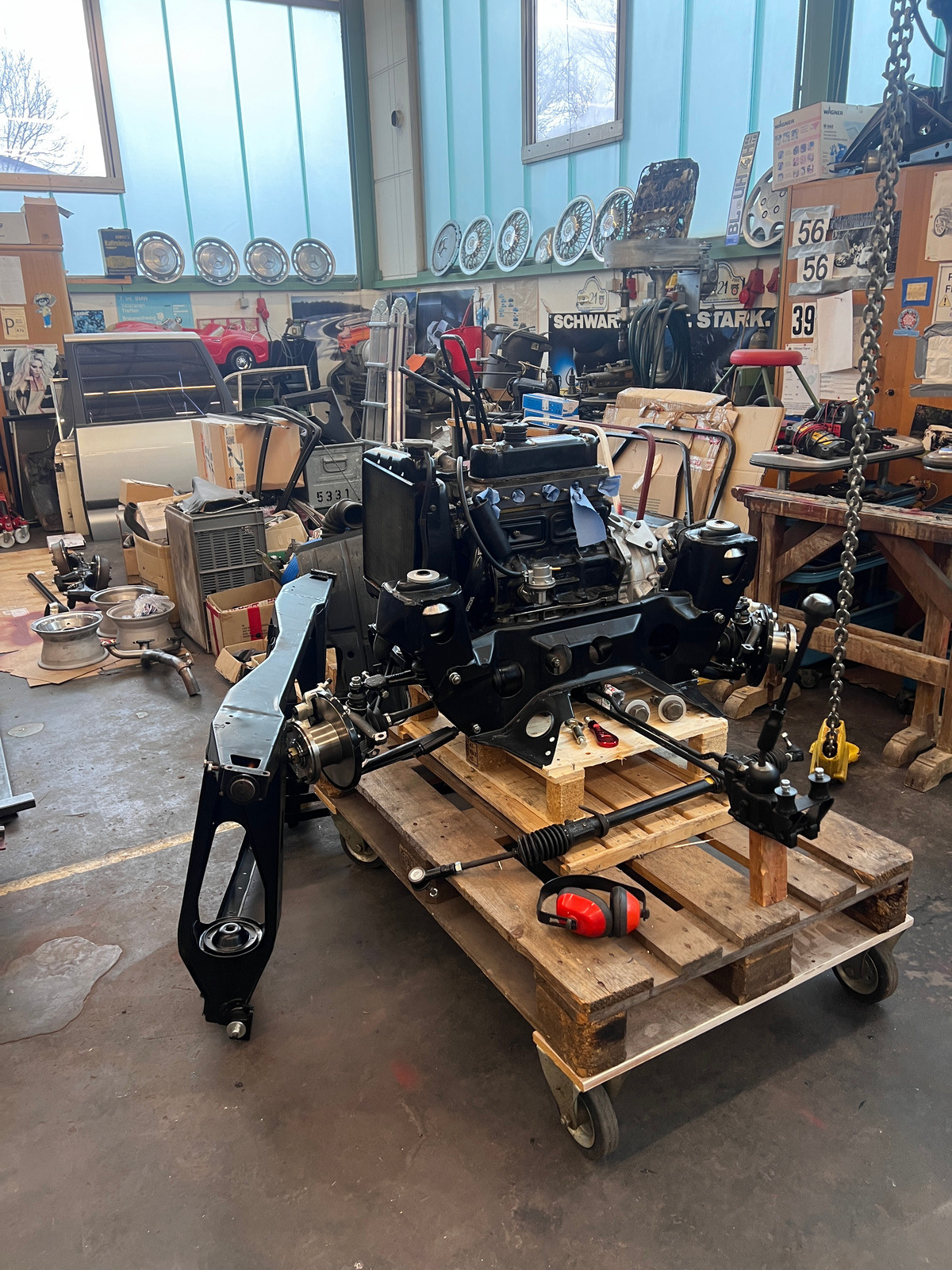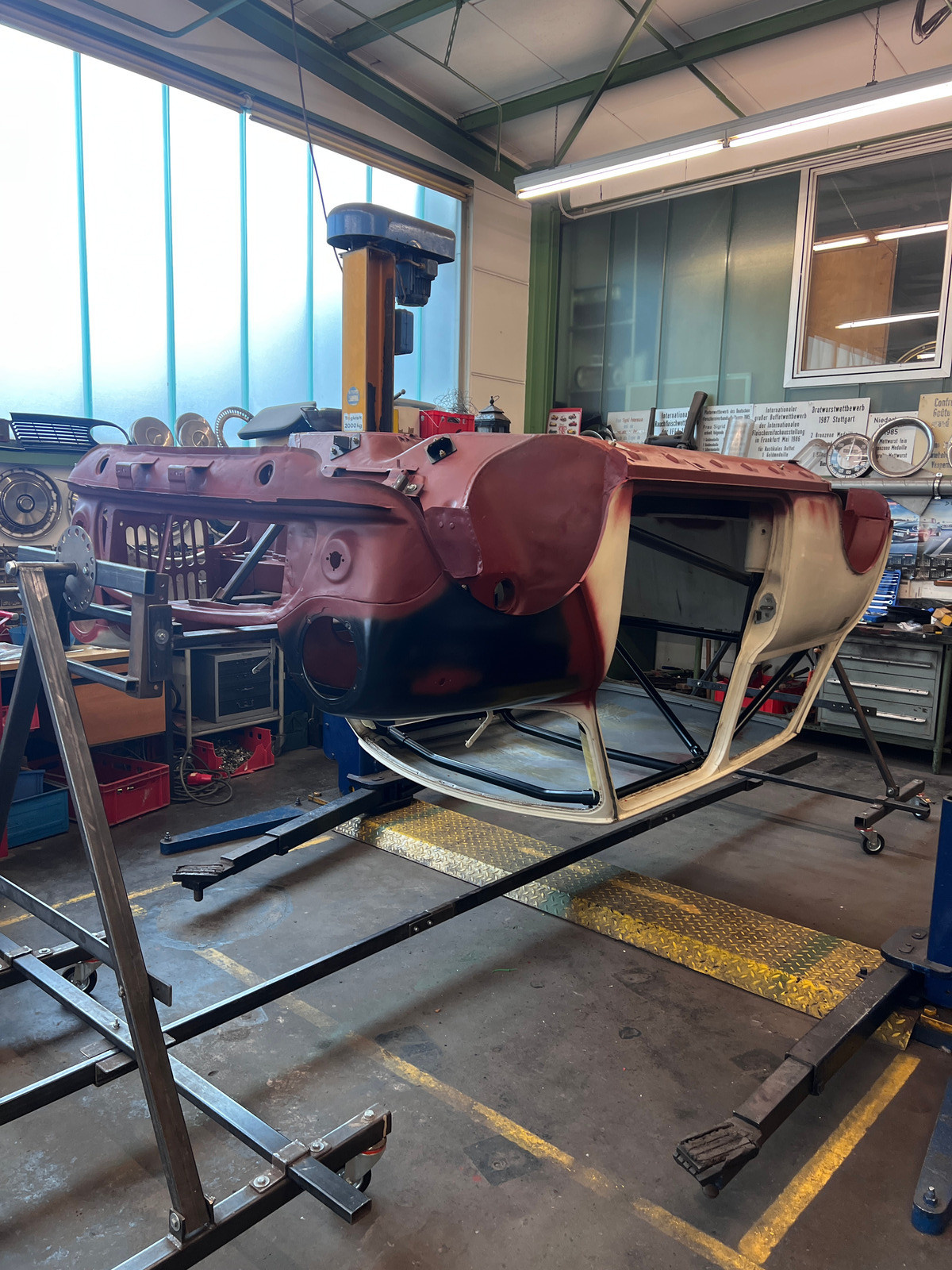 Beide Hilfsrahmen sind jetzt wieder aus dem Auto draußen und nurnoch die Rohkarosserie ist übrig.