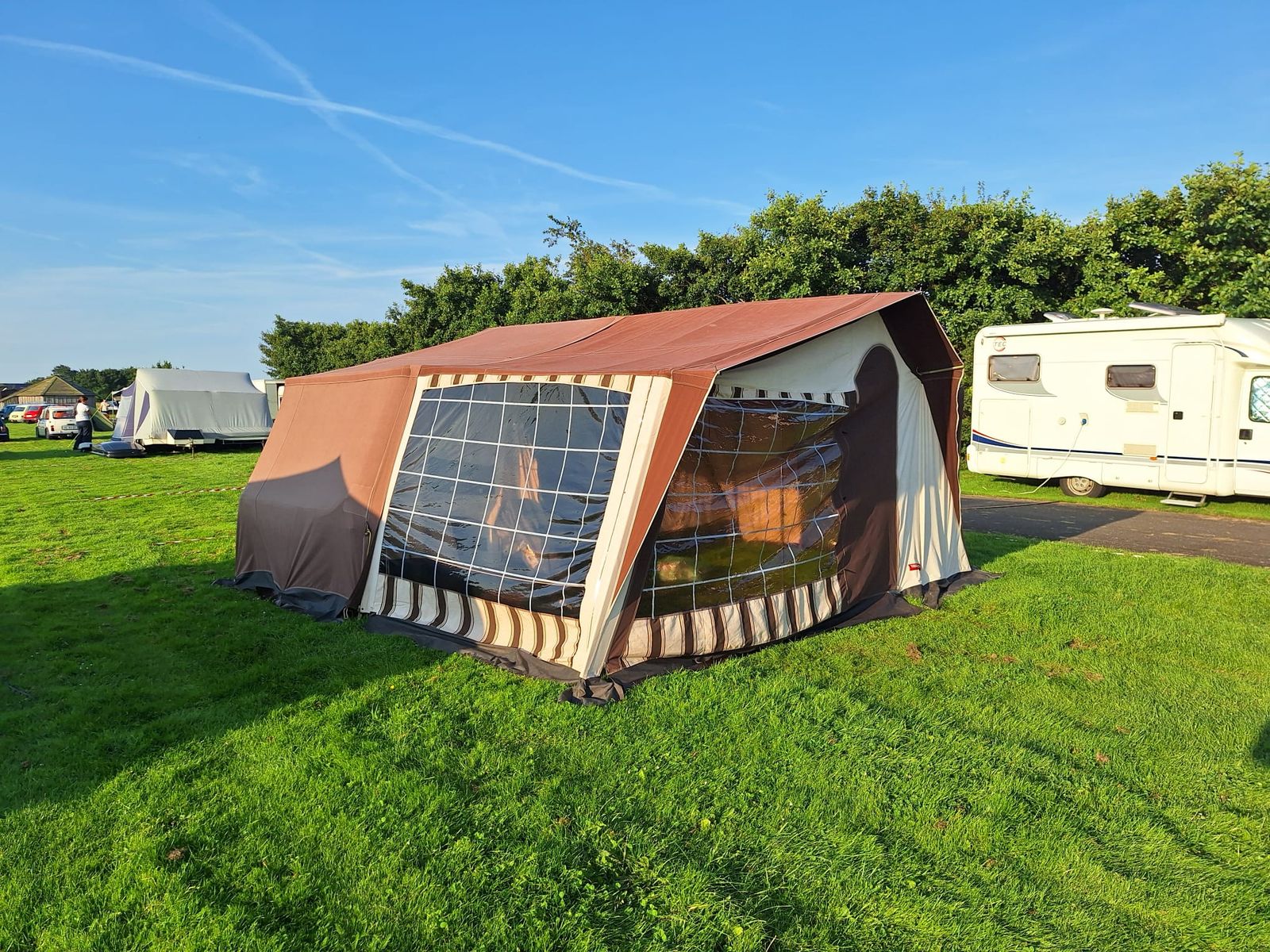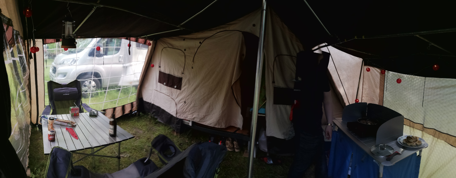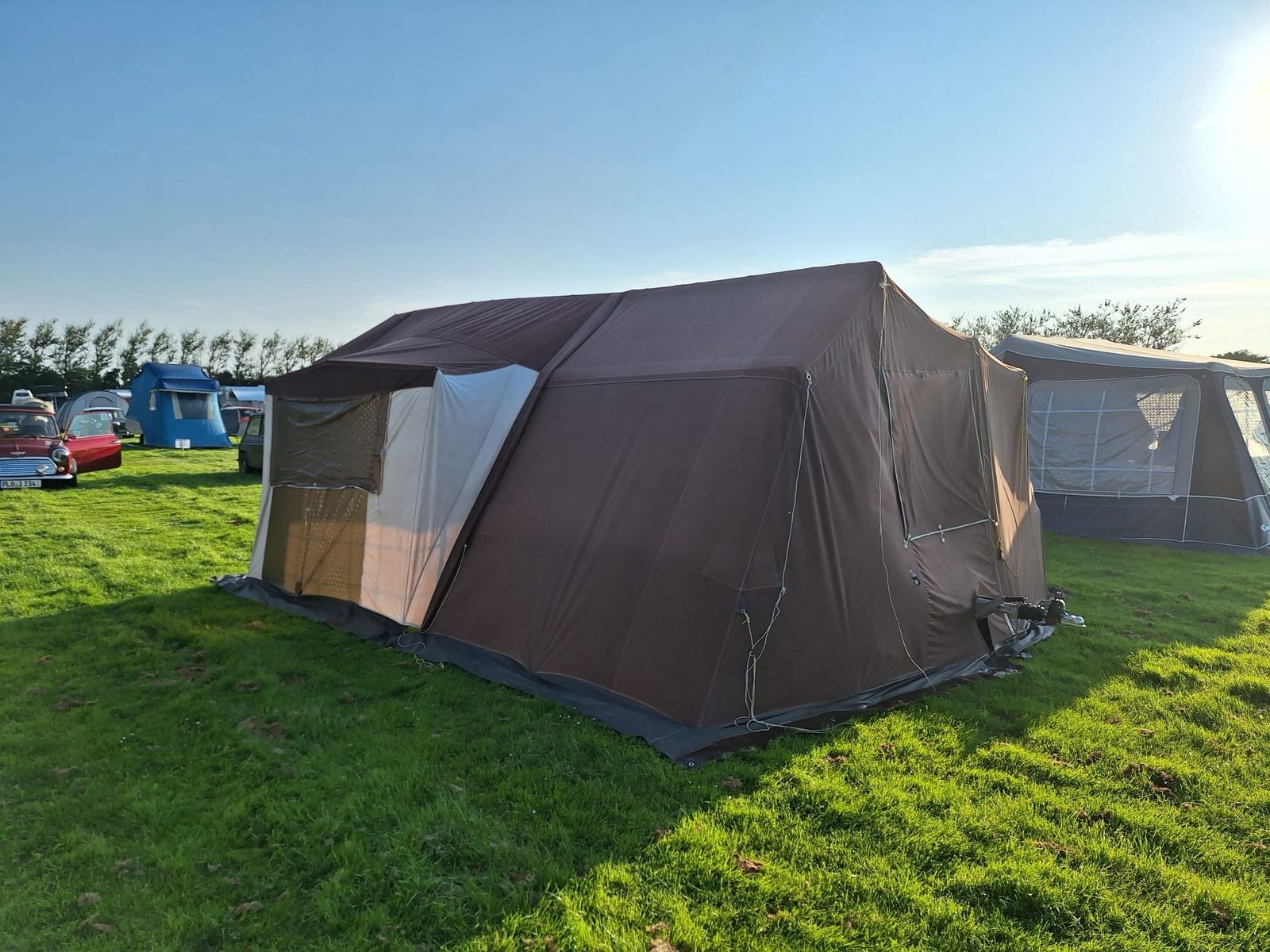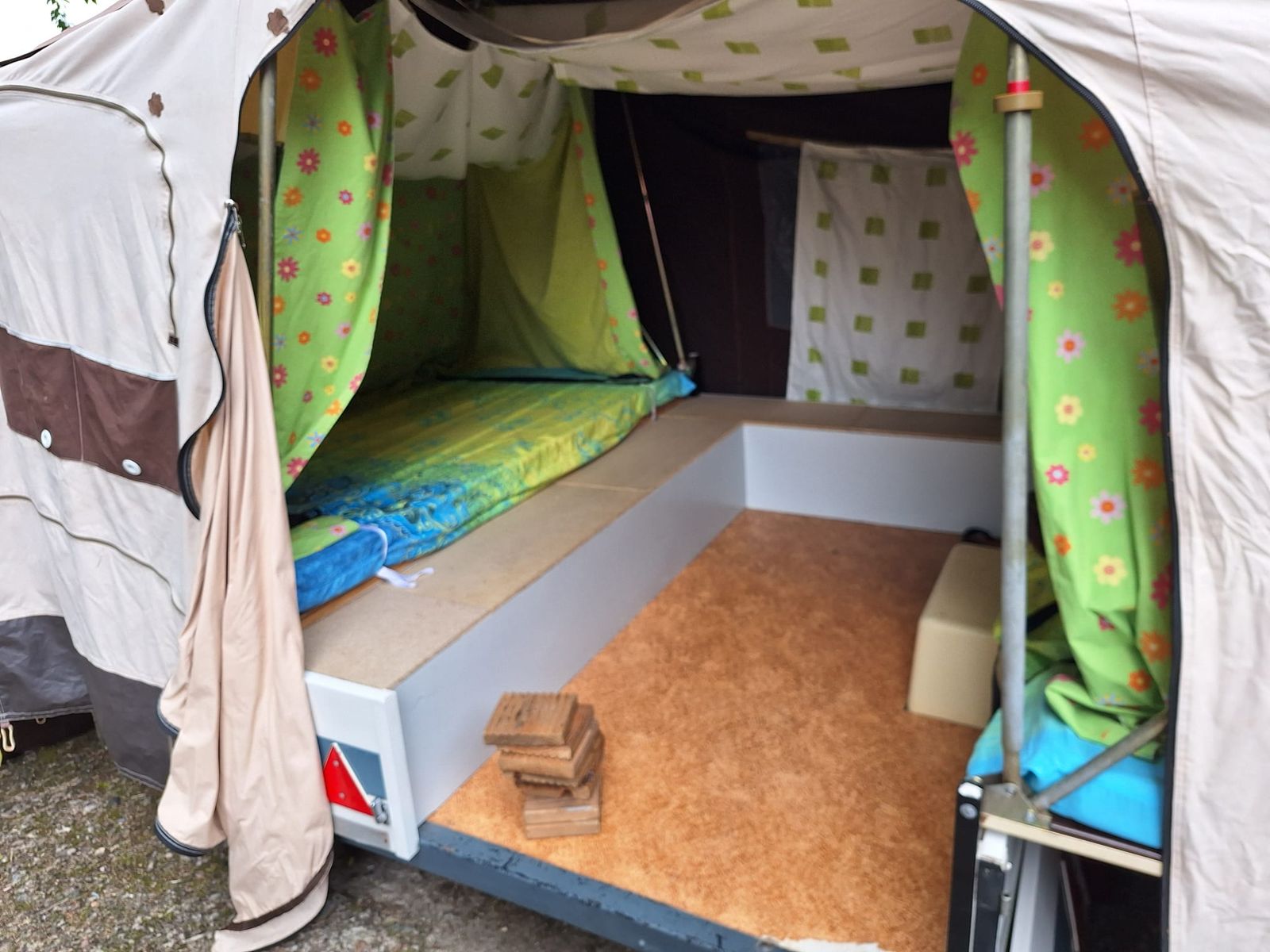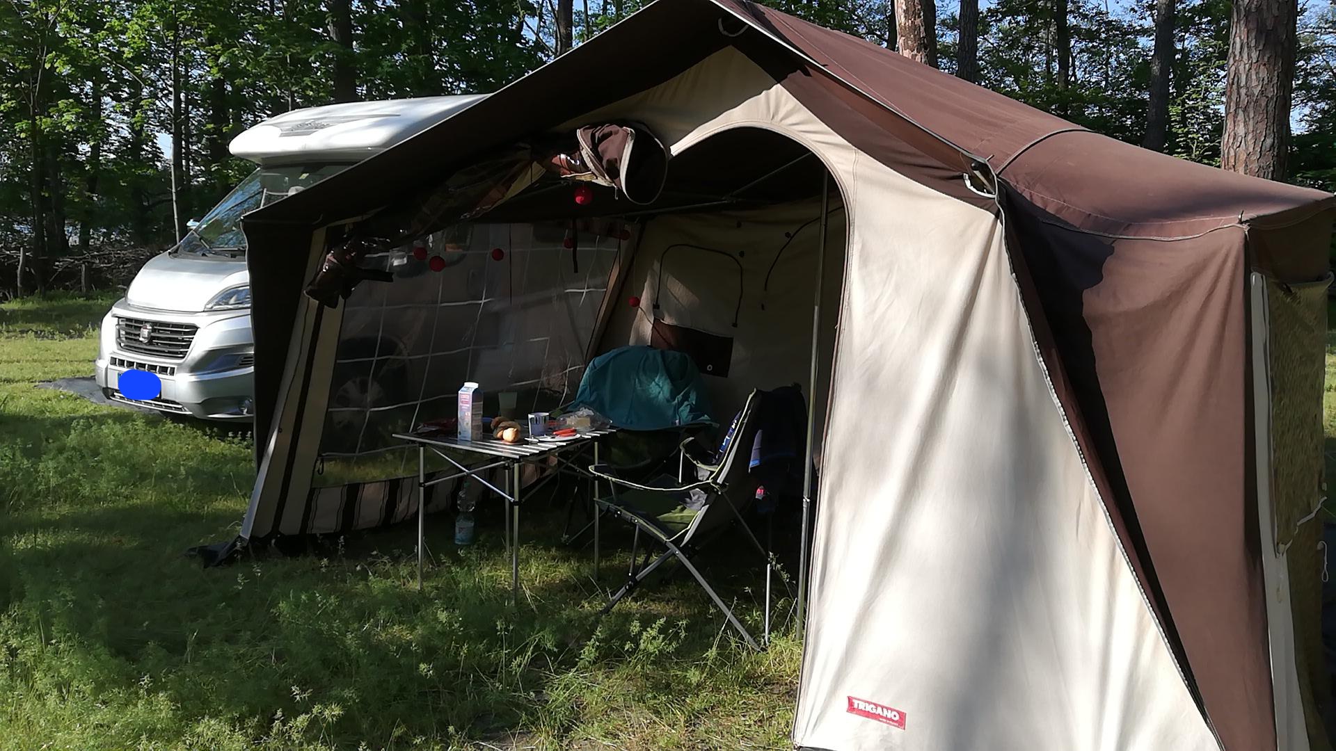 da wir durch Zufall auf einen Puck umsteigen konnten, wollen wir unseren Falter nach 2 schönen Jahren wieder verkaufen. Der Falter ist gebremst und hat ein zGG von 350 KG. HU ist bis Juli 2025 gültig. Wir haben ihn mit einem 53 PS SPI gezogen und das klappte wunderbar. In den 2 Jahren wurden von einer Sattlerei div. kleine Löcher geschlossen und der Reißverschluss zum Schlafbereich erneuert. Der Zeltstoff wurde regelmäßig imprägniert und ist dicht (haben wir im Juli eine Woche testen dürfen). Außerdem haben wir mehrere Stützstangen ausgetauscht. Das Gestänge ist komplett und mit farbigen Isolierband markiert. So geht der Aufbau recht schnell. Die Matratzen sind 9cm dick, nicht durchgelegen und wurden immer mit Bezug benutzt. Mit Baujahr 1986 gibt es natürlich leichte Alterserscheinungen. Insgesamt steht der Trigano ganz gut da. Ich hätte diesen Winter lediglich die Staukästen gestrichen, damit die neuen Deckel und die Kästen wieder einheitlich aussehen. Da kann sich nun aber der neue Eigentümer gestalterisch austoben ;) .