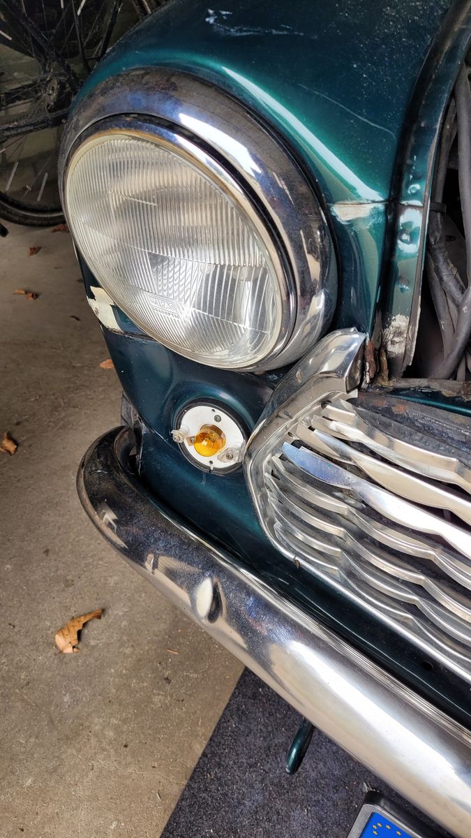 Der Mini ist zwar grundsätzlich fahrbereit, allerdings aufgrund des Knicks im Kotflügel vorne rechts doch eher ein Fall für einen Trailer, da die mit dem Knick einhergehende Scheinwerfereinstellung nicht wirklich der StVO entsprechen dürfte.
