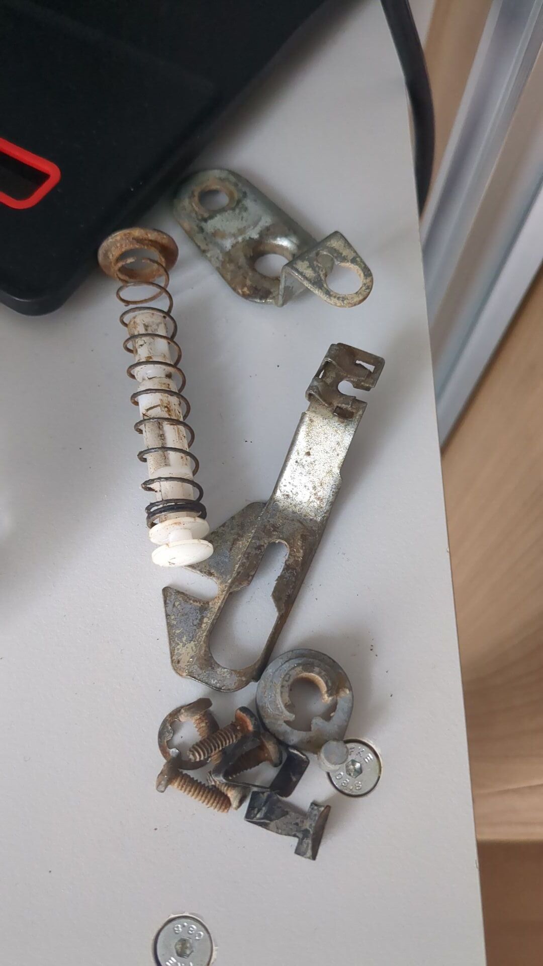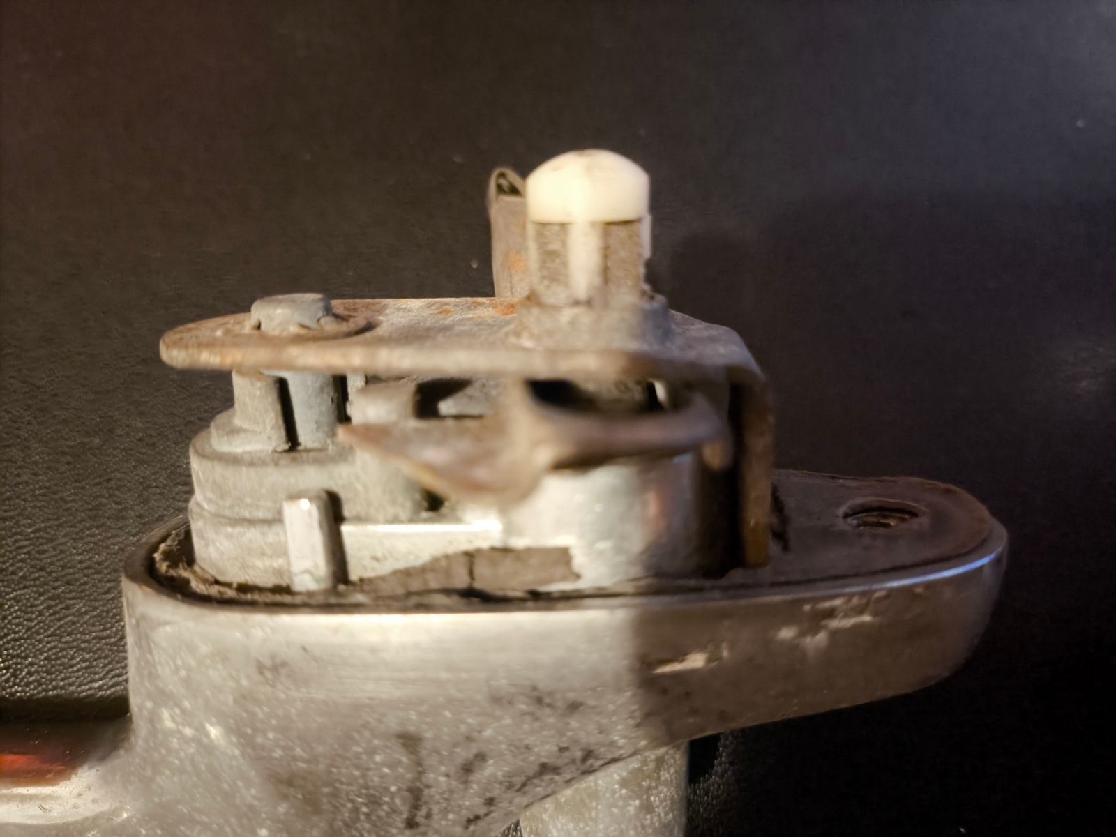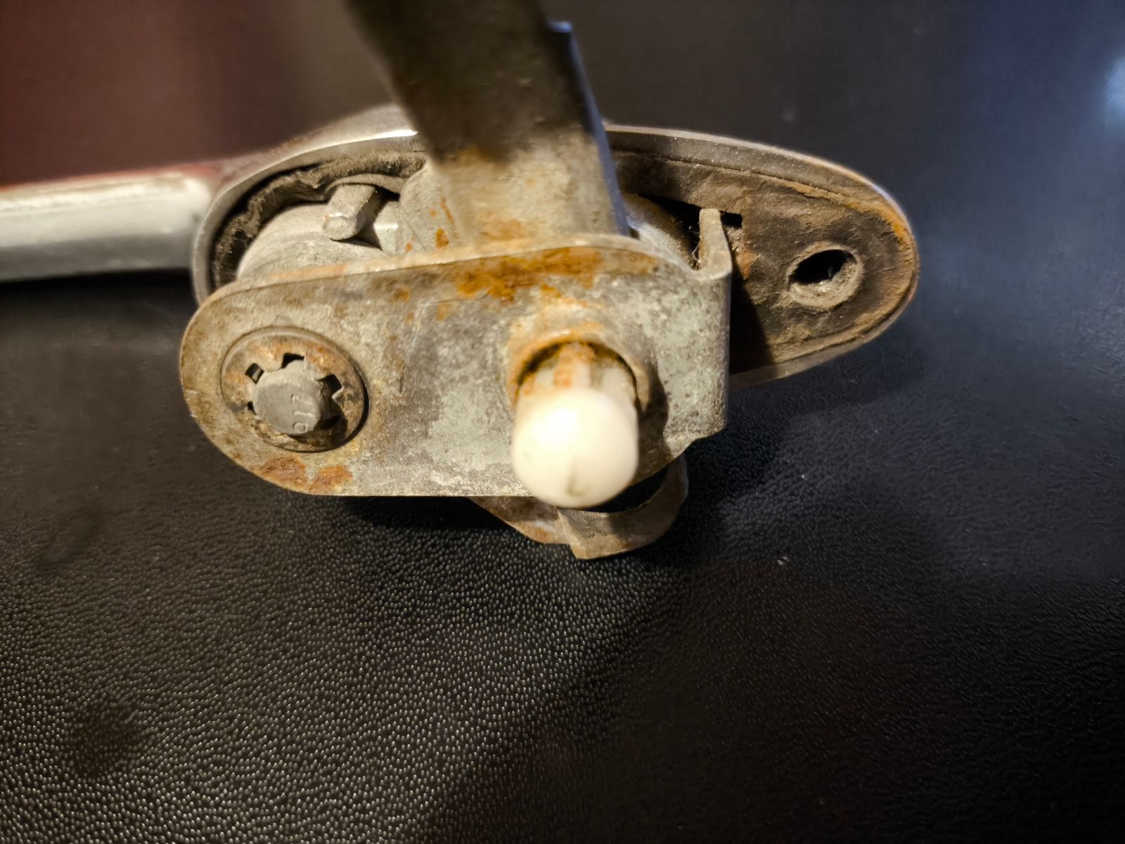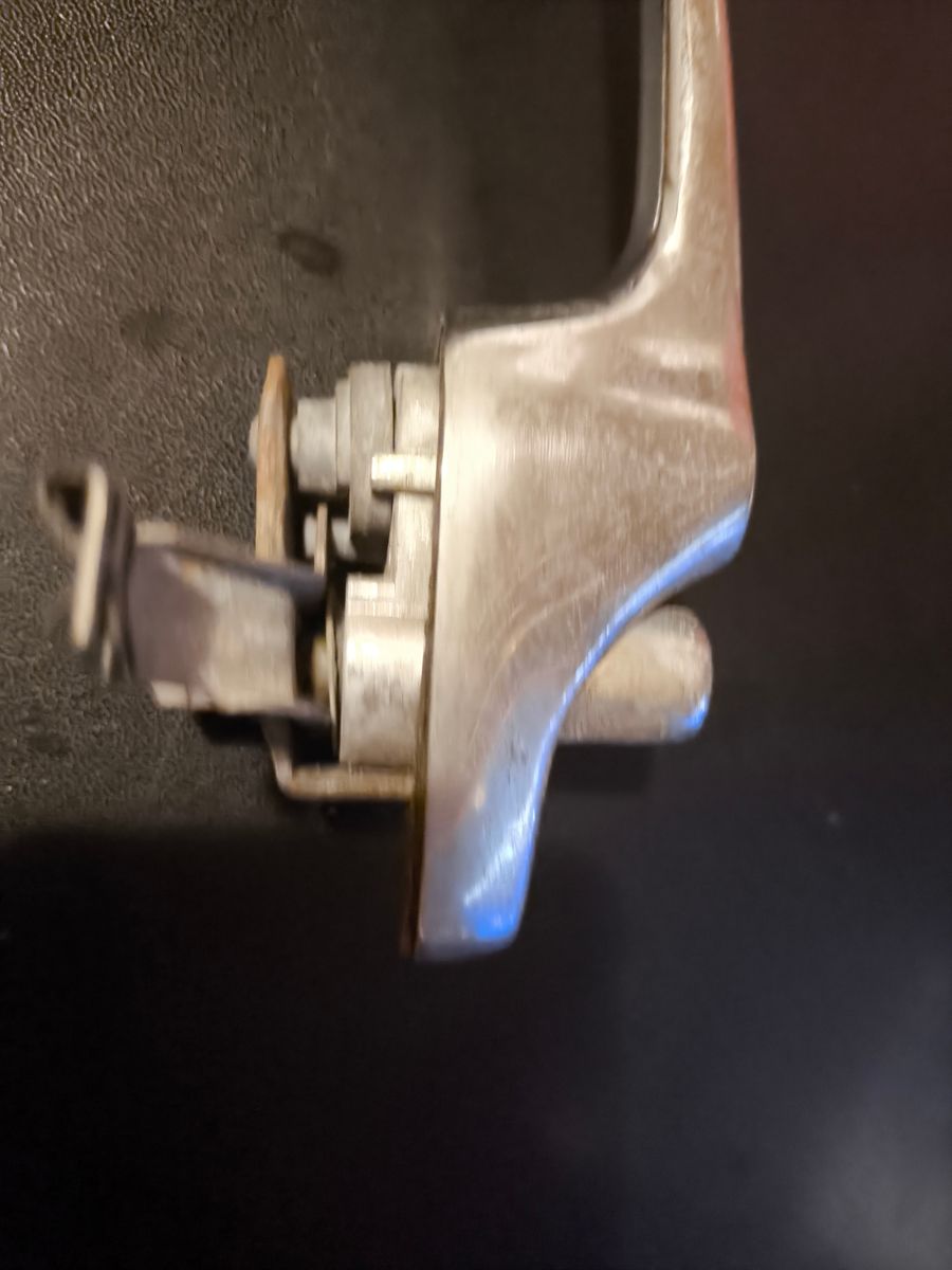 Die Feder gehört auf den weissen Plastikbolzen, der aussen vom Chromknopf gedrückt wird, um die Türe zu öffnen, richtig?