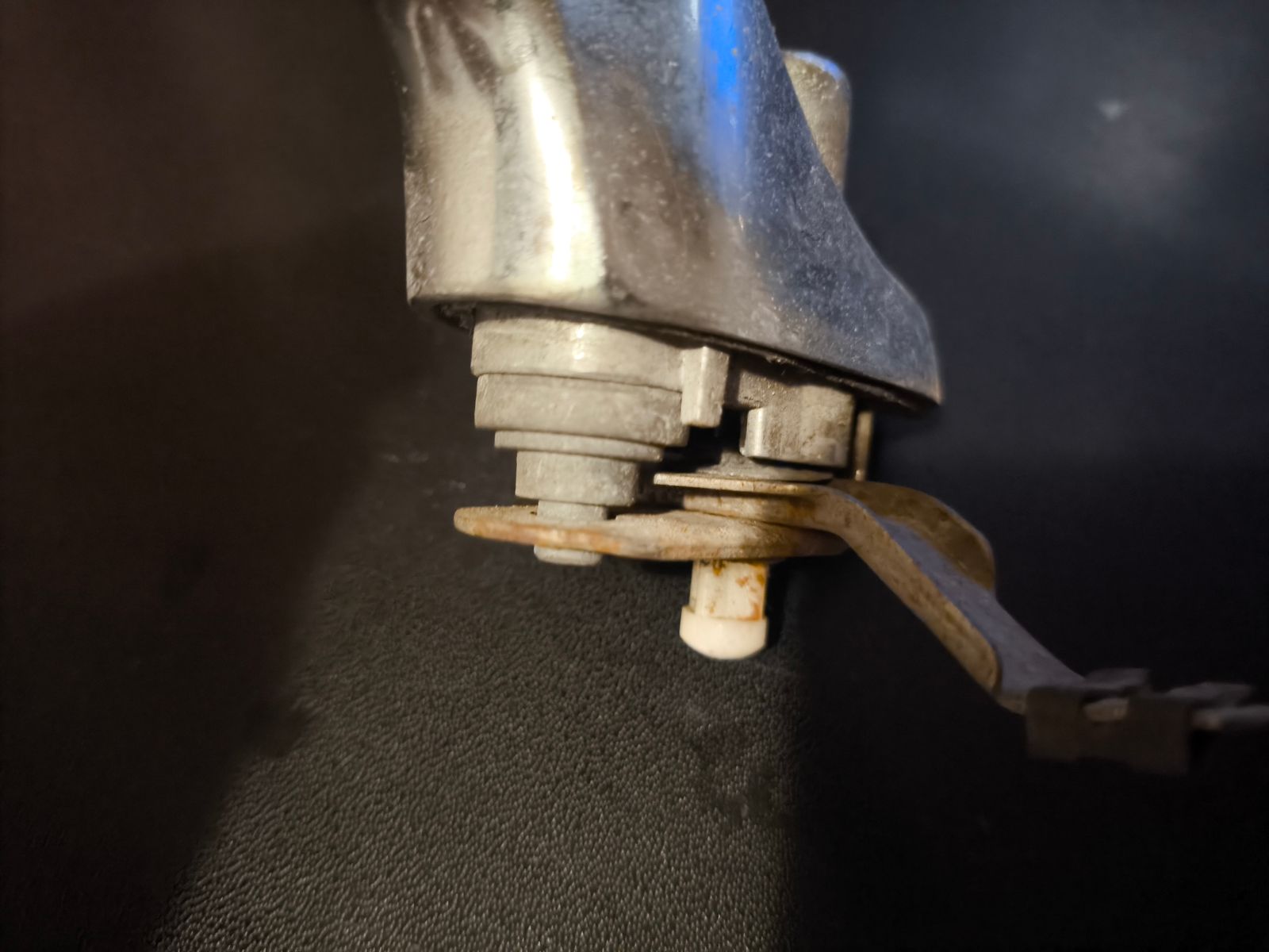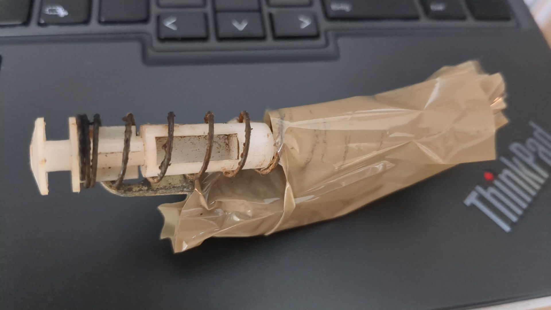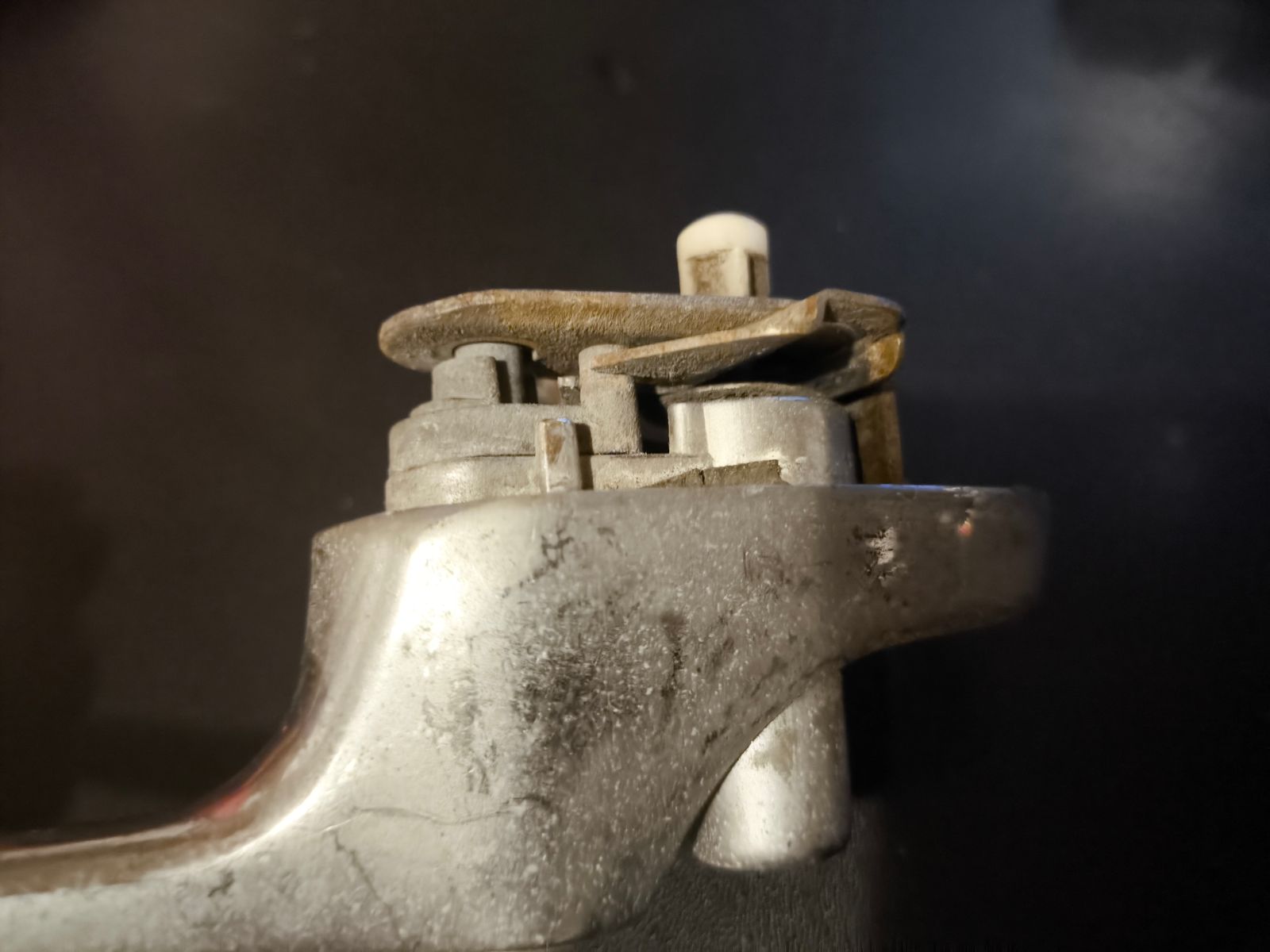 Die Feder gehört auf den weissen Plastikbolzen, der aussen vom Chromknopf gedrückt wird, um die Türe zu öffnen, richtig?