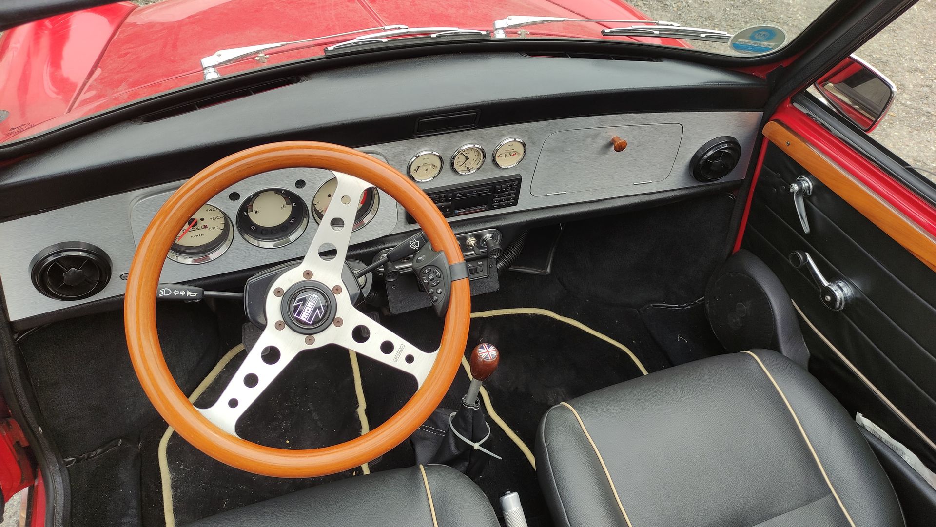 Der Mini hat ein neues Verdeck erhalten und steht seitdem nur in der Garage. Mit dazu hat er einen 1000er Gutman G-Kat nachgerüstet bekommen, Blaupunkt DAB Autoradio, Audison 5Kanal Endstufe, Doppelsubwoofer JBL FUSE (2 x 20er unter den Sitzen), 16cm Frontsystem in den Türen & Hochtöner an den A-Säulen, umgebaute Schalterleise mit Lucas Kippschaltern siehe Fotos, original Armaturenbrett in Alu-Optik, und und und….. Und alles soweit Rückverbaubar.