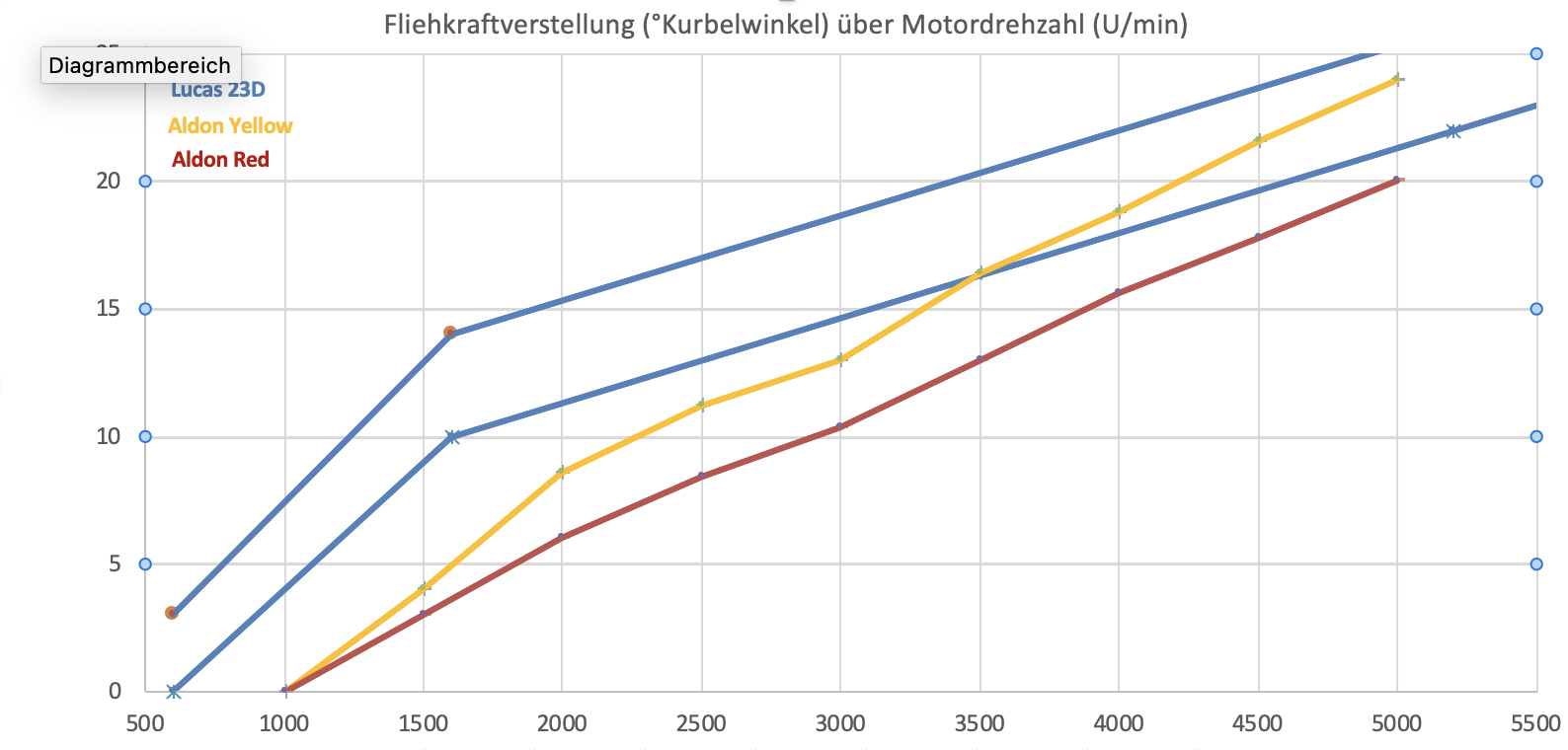 Das "Datenblatt" gibt 2° voT statisch .. oder 4° bei 600U/min an. Ist ja auch quasi das gleiche .. wenn ich 2°nehmen und eine mittlere Verstellung bei 600U/min von 2° ...