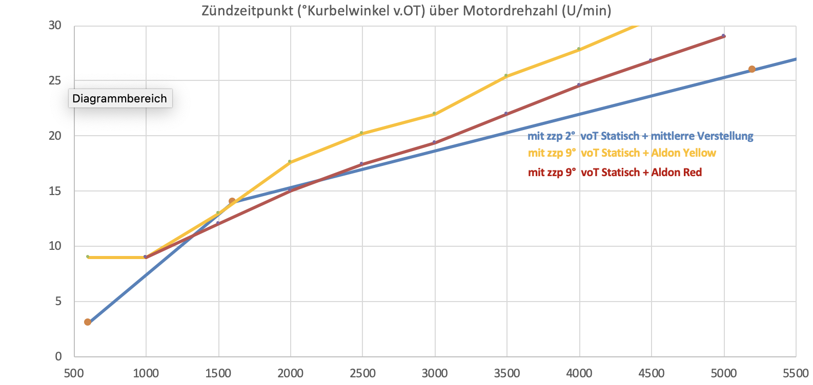 Im englischen Forum finden sich "for Aldon distributors only, the manufacturer'2 recommendation are as follows" ... 10:1 CR für den Yellow 8-10deg. Für den Red heist es "race only".. der Einfachheit halber nehme ich für Yellow und Red 9°voT