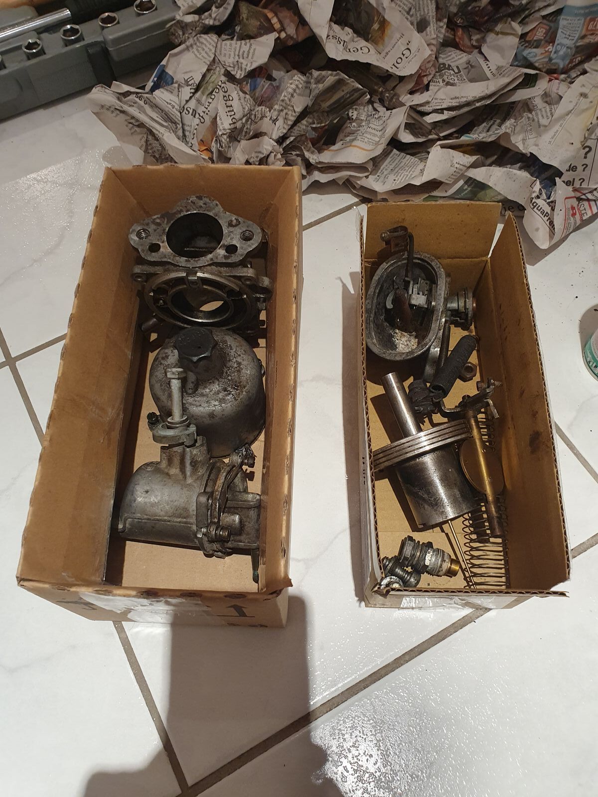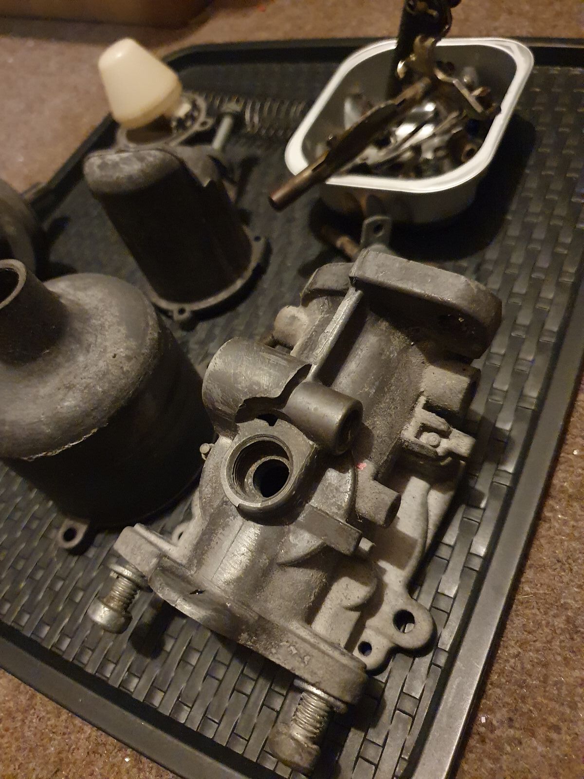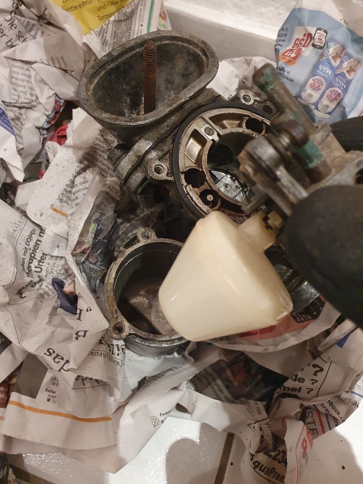 Was habe ich gemacht: Günstig einen HS4-Vergaser erstanden, um diesen zu überholen. Die Bilder zeigen den Vergaser direkt nach dem auspacken und zerlegen. Der Vergaserkolben glänzt, die Ansaugbrücke/Steg im Vergaser auch. Alles ist recht verdreckt, aber nichts, was nicht hinzubekommen wäre...ja, und da fangen meine Probleme an: